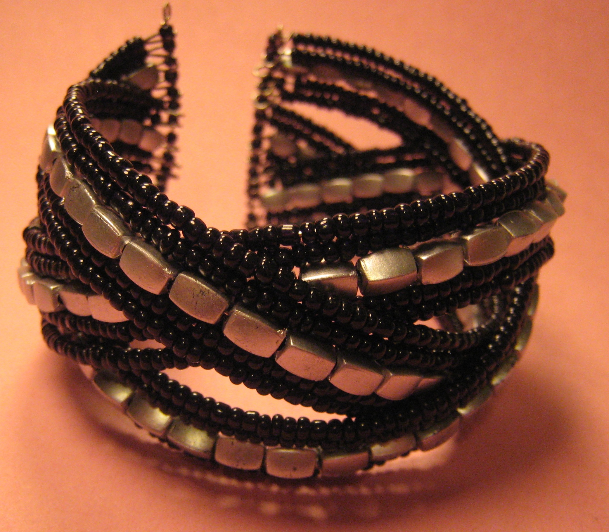 Made out of glass seed beads and acrylic beads strung on steel wire and looped through. Wire is bendable to fit all wrist sizes and retracts back to its cuff shape.