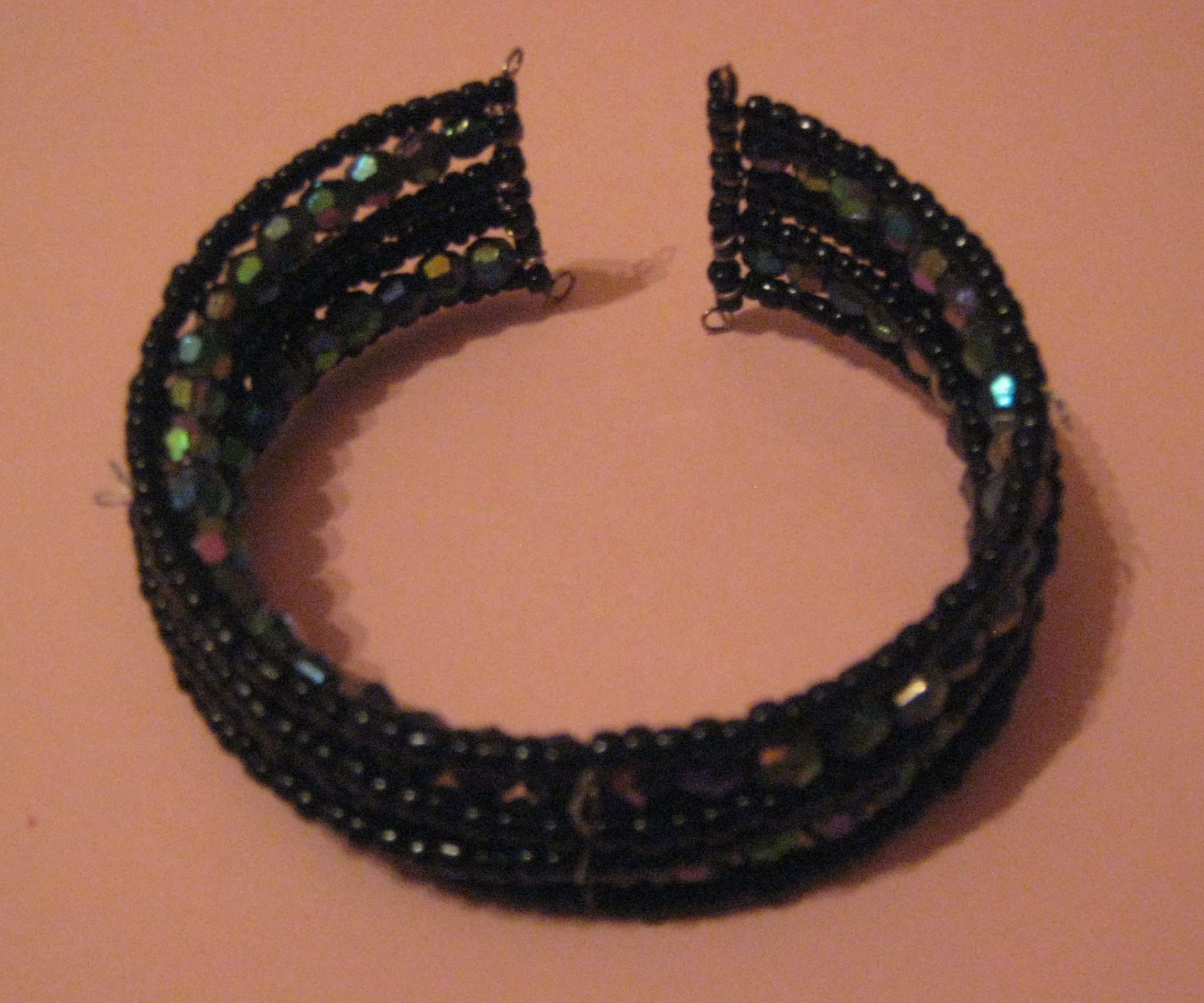 Made out of glass seed beads and aurora borealis finish faceted acrylic beads on steel wire and looped through. Wire is bendable to fit all wrist sizes and retracts back to its cuff shape.