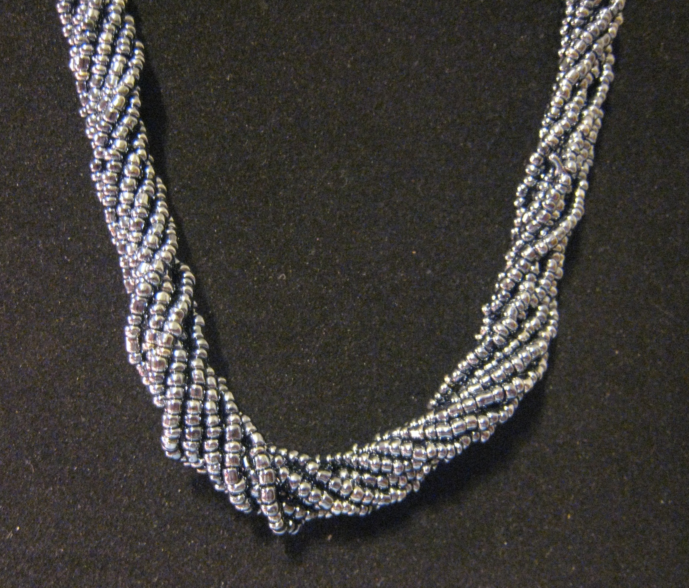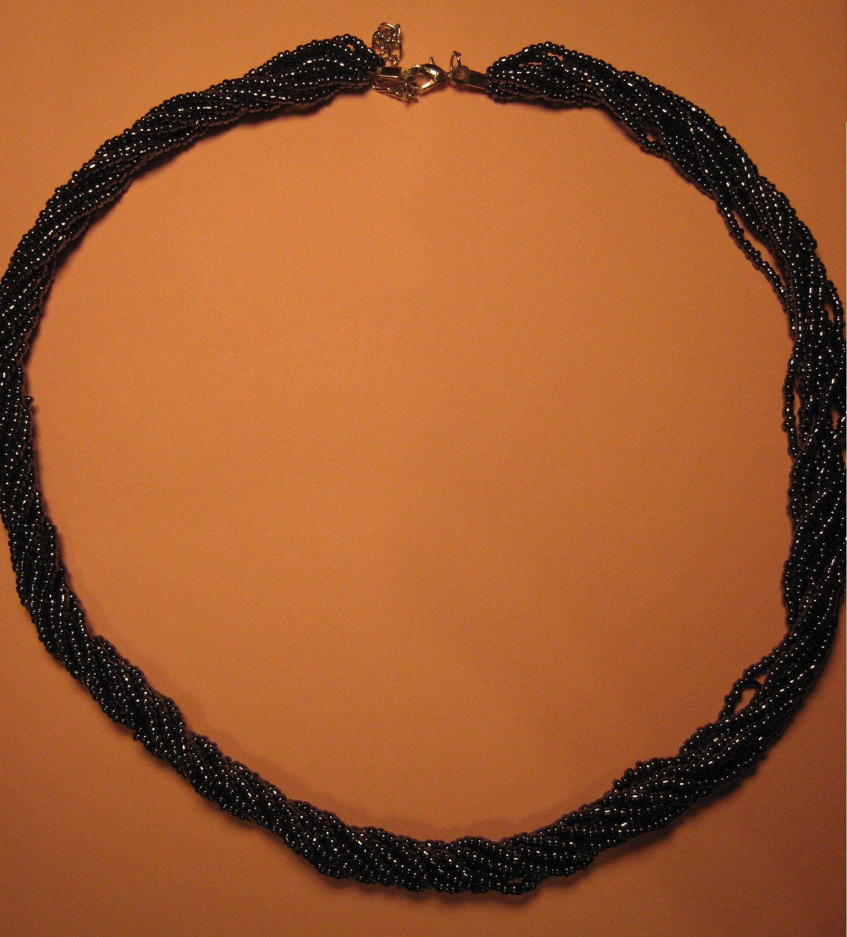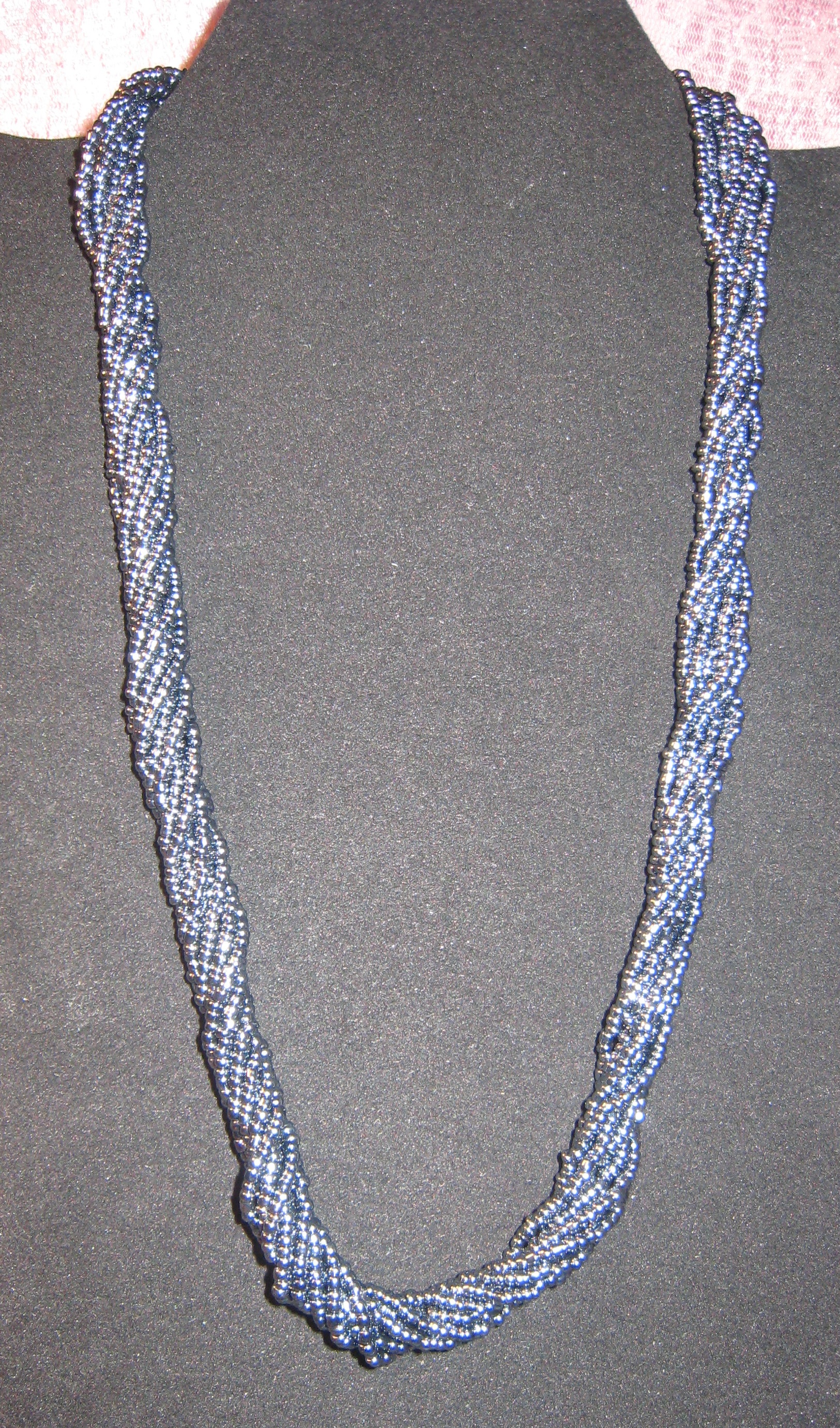 Multiple strands of tiny gunmetal black colored seed beads twisted into a beautiful, stylish necklace measuring 22-24" long.