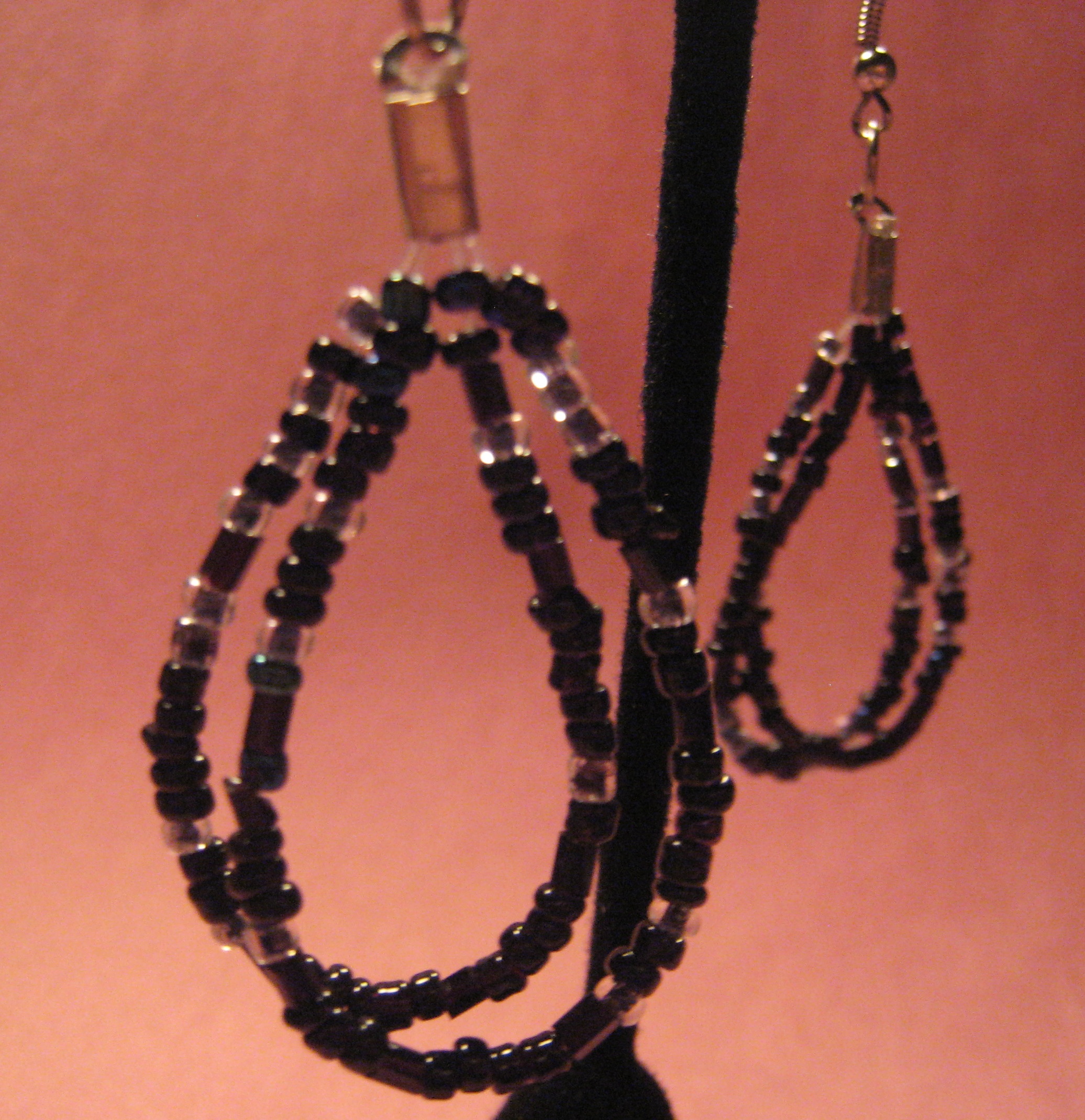 Strung black, clear & ab seed beads with black seed tubes hung in 2 loops and finished with a plated crimp bead attached to a metal fish hook pierced ear wire. Earrings are approximately 2" long.