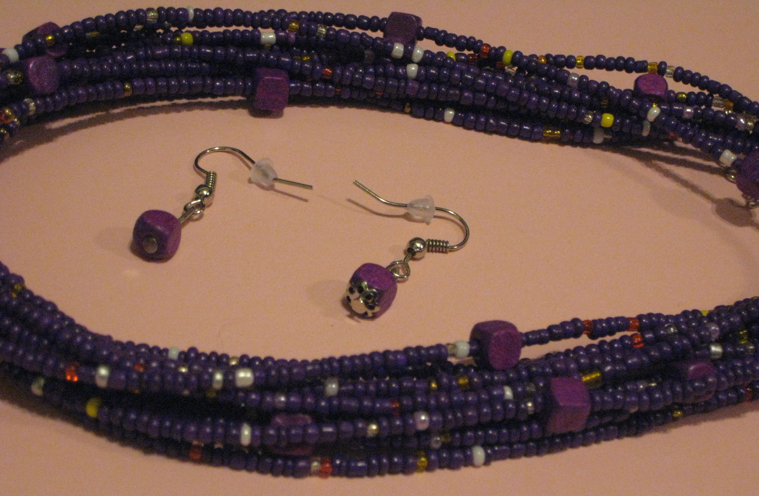 Multiple strands of tiny purple and assorted colors seed beads and square wood beads create a stylish necklace measuring 26" long.