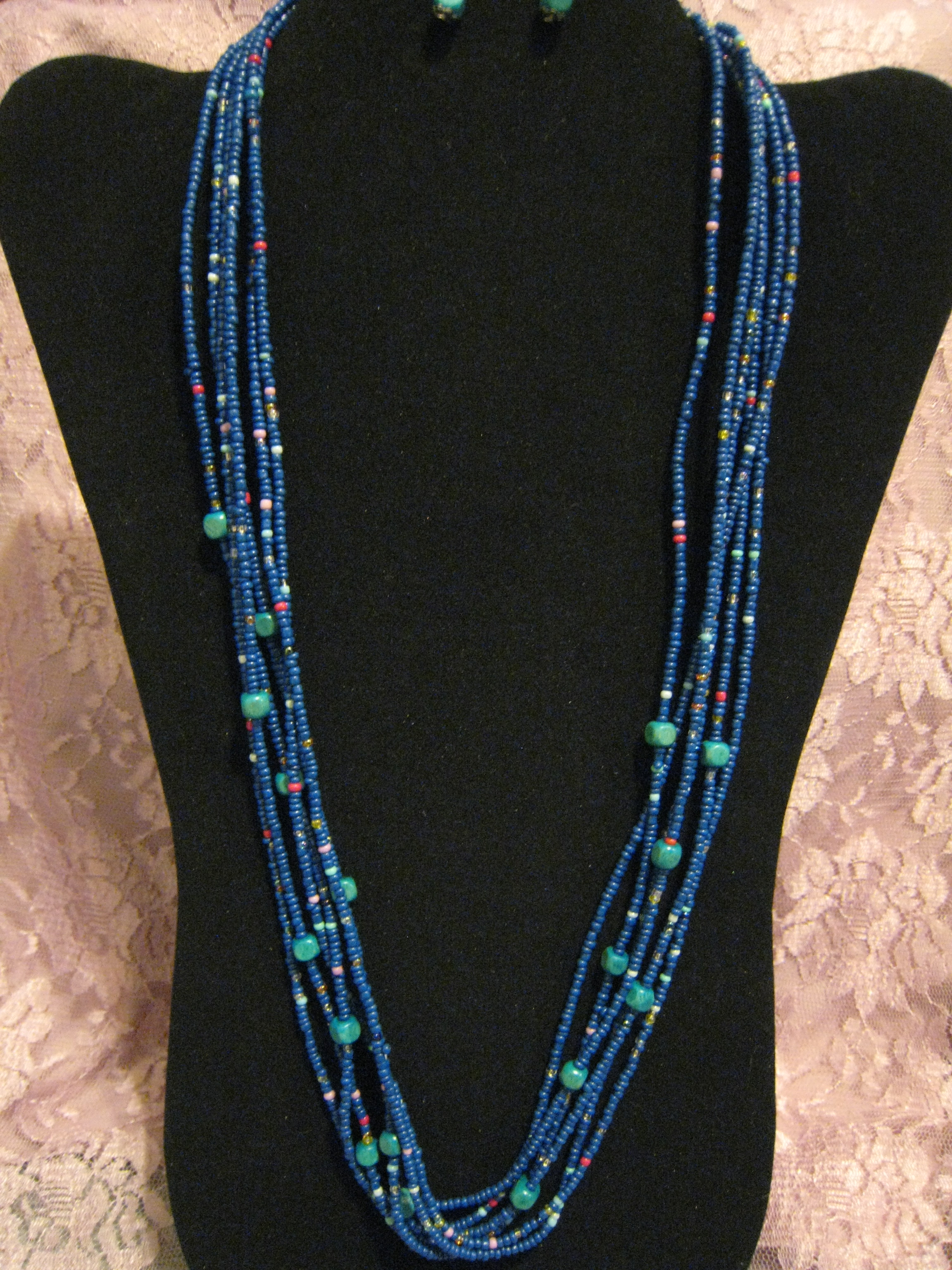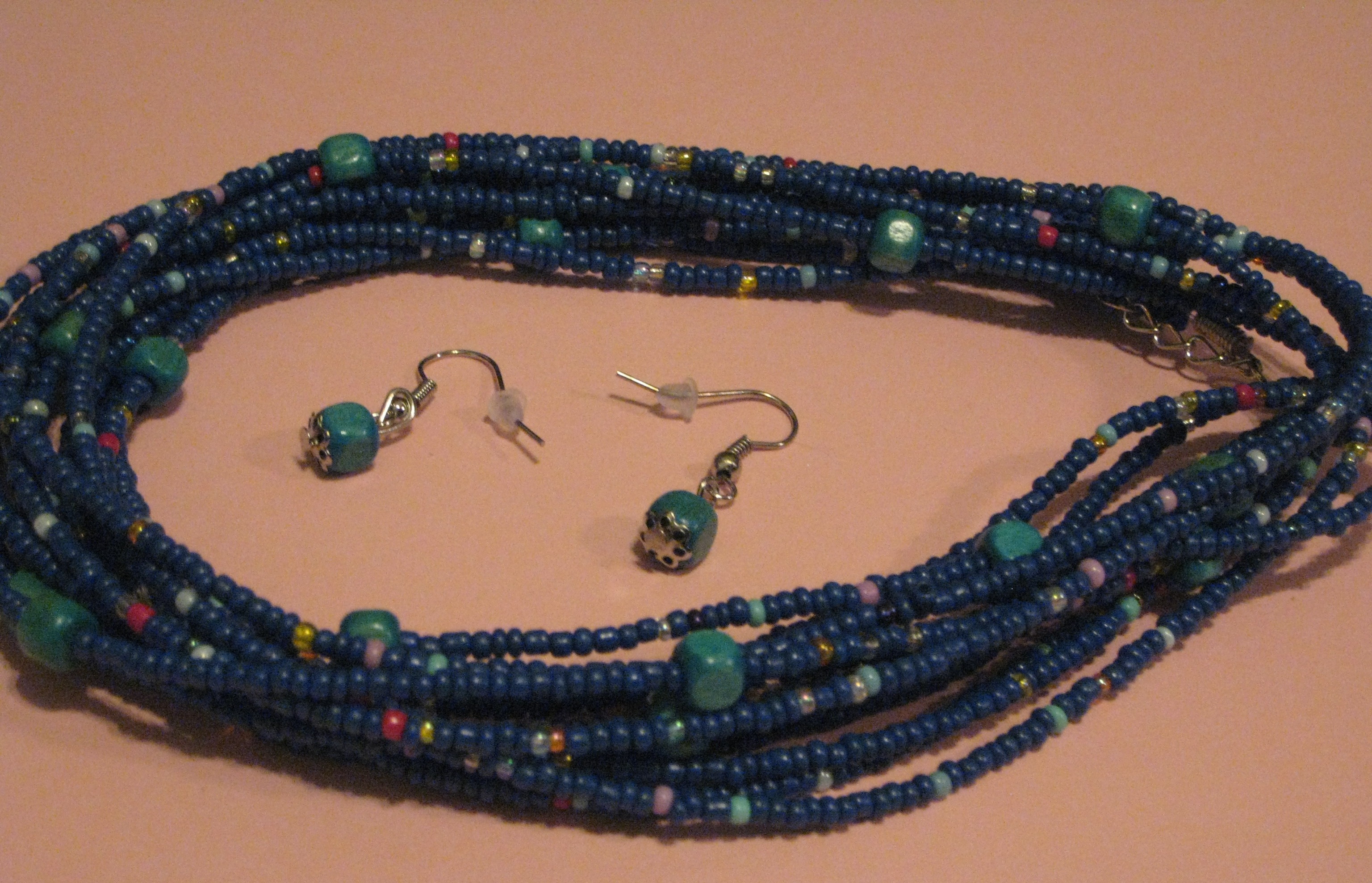 Multiple strands of tiny blue an mixed colors seed beads and blue teal square wood beads create a stylish necklace measuring 26" long.