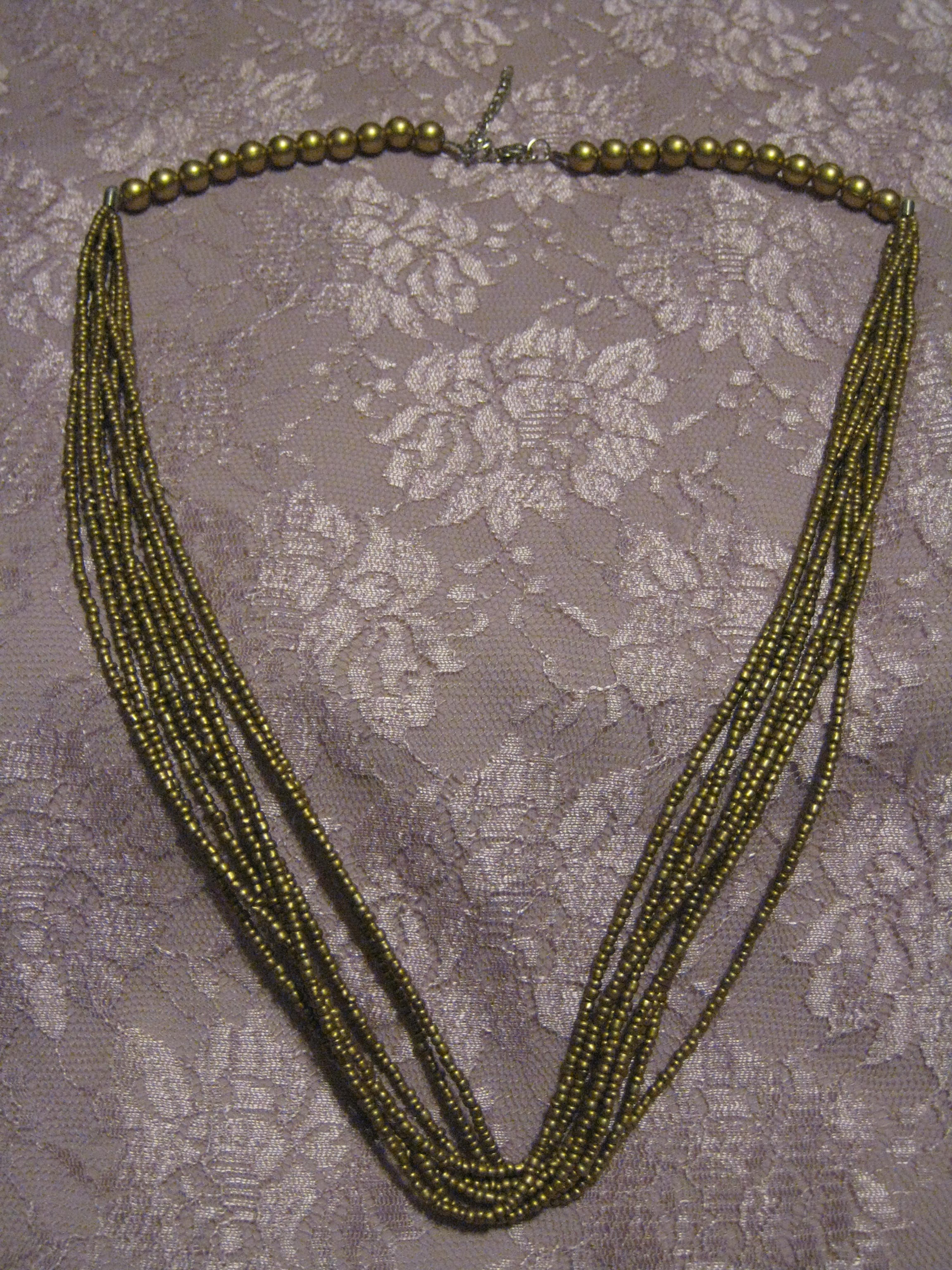 Round matte gold painted acrylic beads and rows of matching seed beads make up this fun necklace measuring 24" with a 2" extender. The matching acrylic earrings measure 3/4" and have steel fishhook earwires.