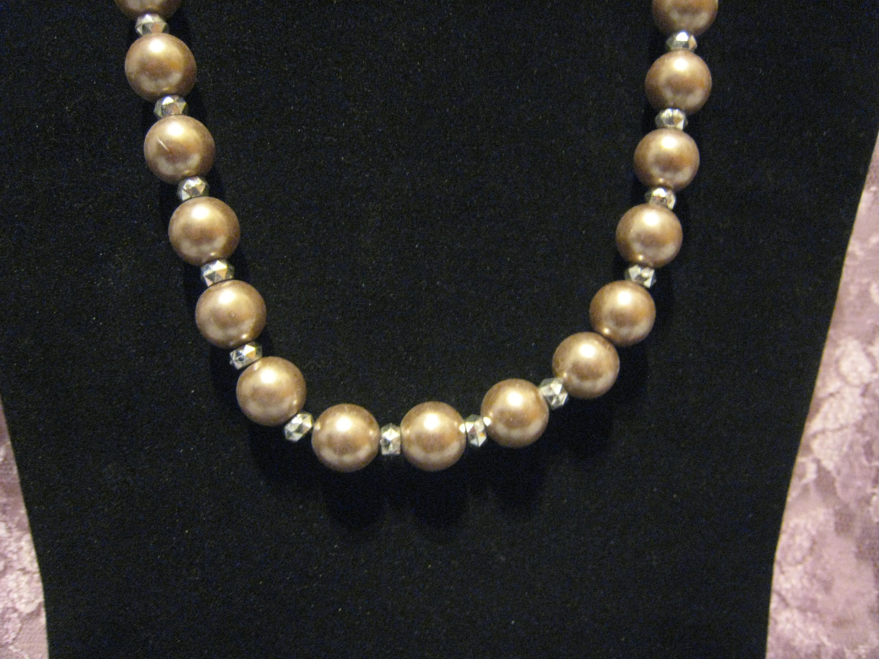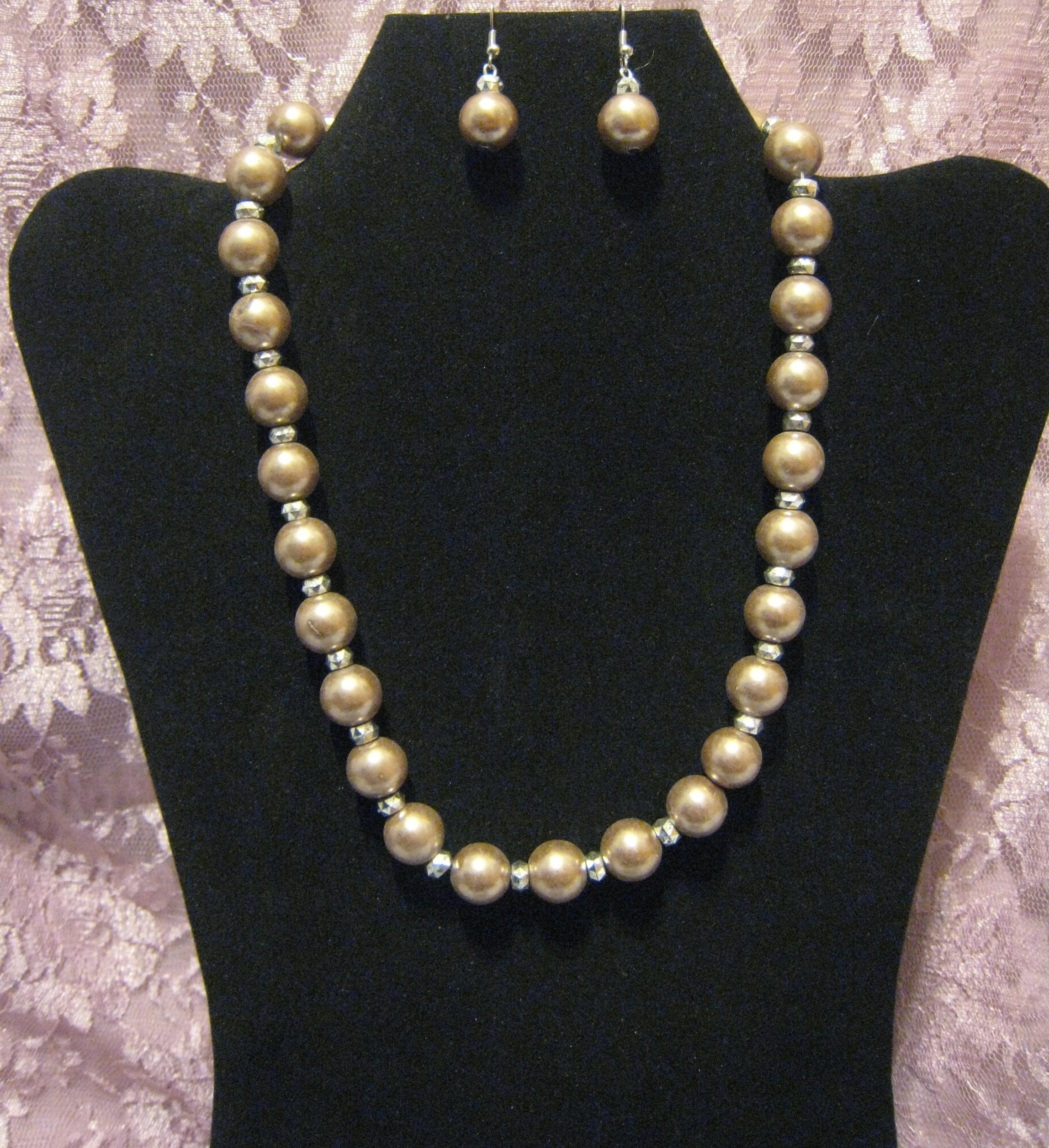 This beautiful necklace and earring set is made out of Cultura glass pearls with silver faceted acrylic spacer beads. The necklace measures 17" long with a lobster claw clasp and has a 2" extender. The earrings measure 1 1/2" long and have steel fishhook earwires.