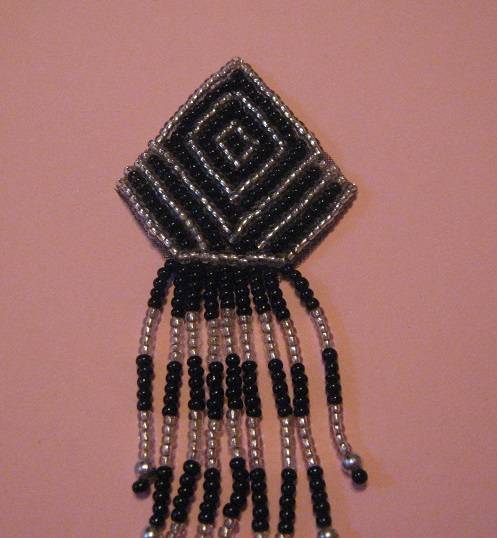 Diamond shaped design with organdy backing, sewn in foil lined seed beads and larger beads with matching dangles. Small rhinestone accent in the center finishes this piece off.