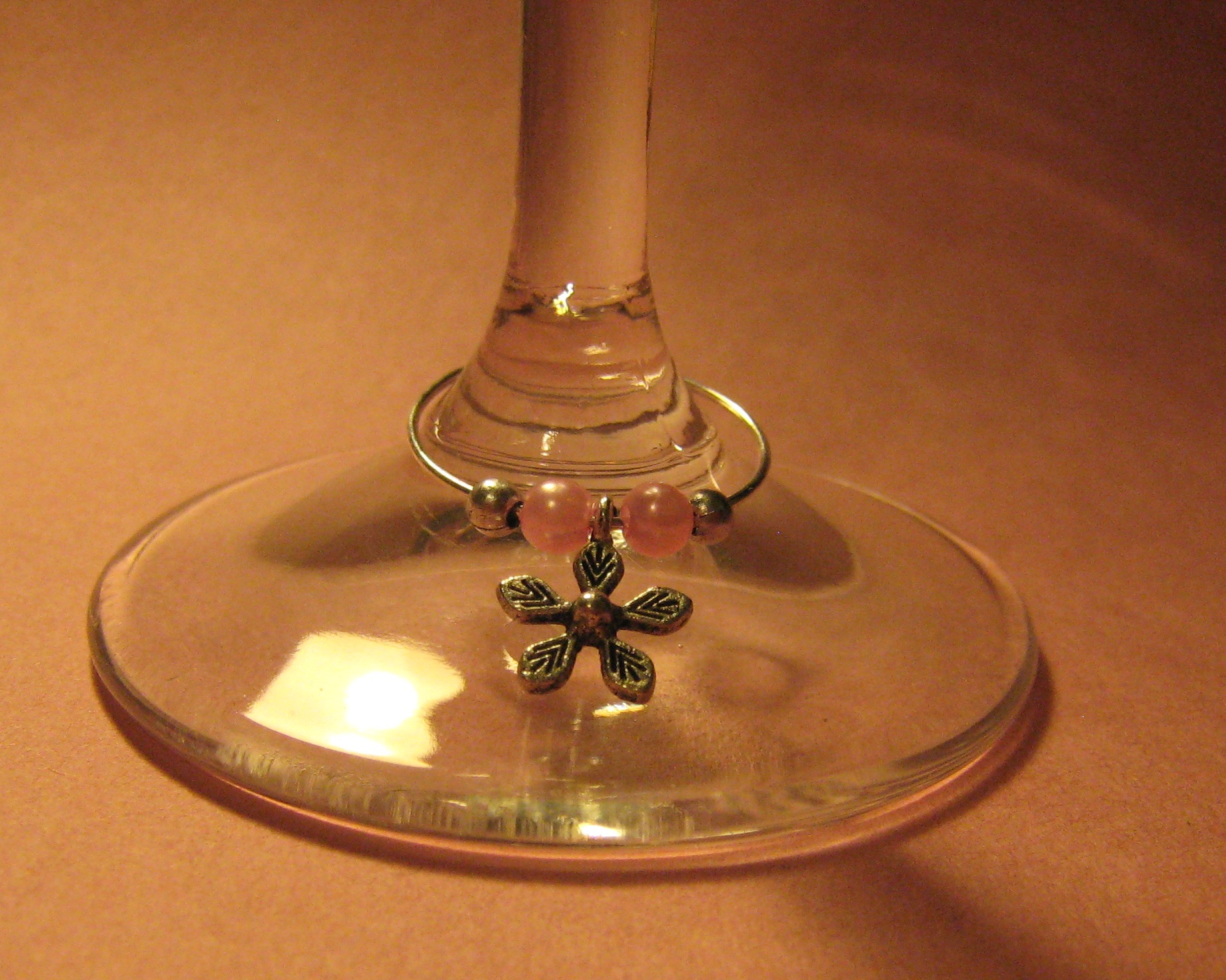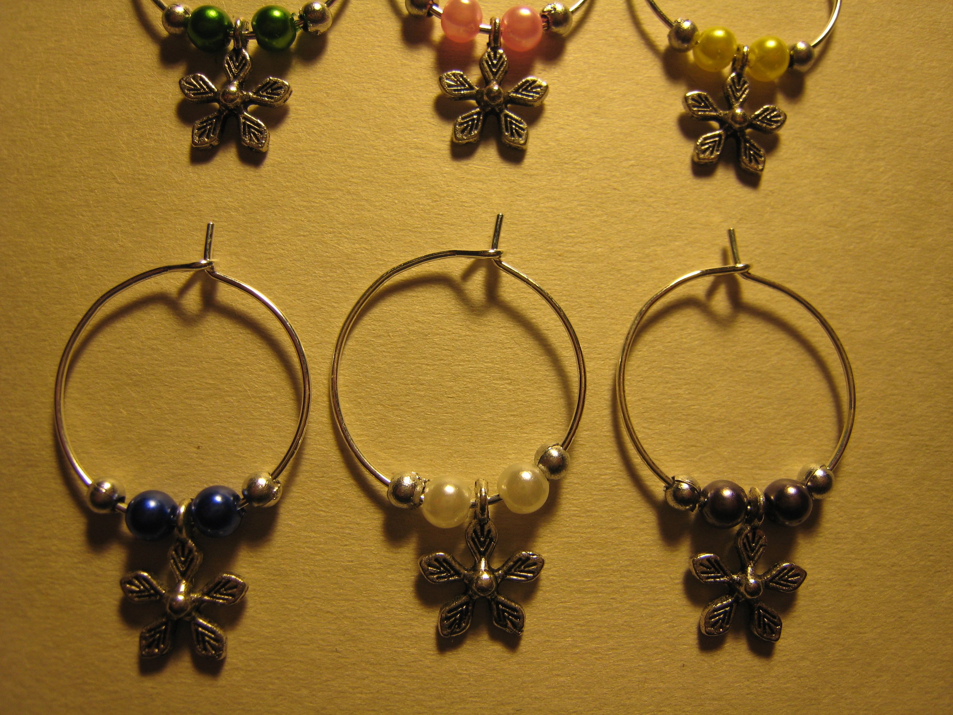 Each set includes 6 metal wine charms with plastic/acrylic beads packaged in a fabric pouch with a card reading: