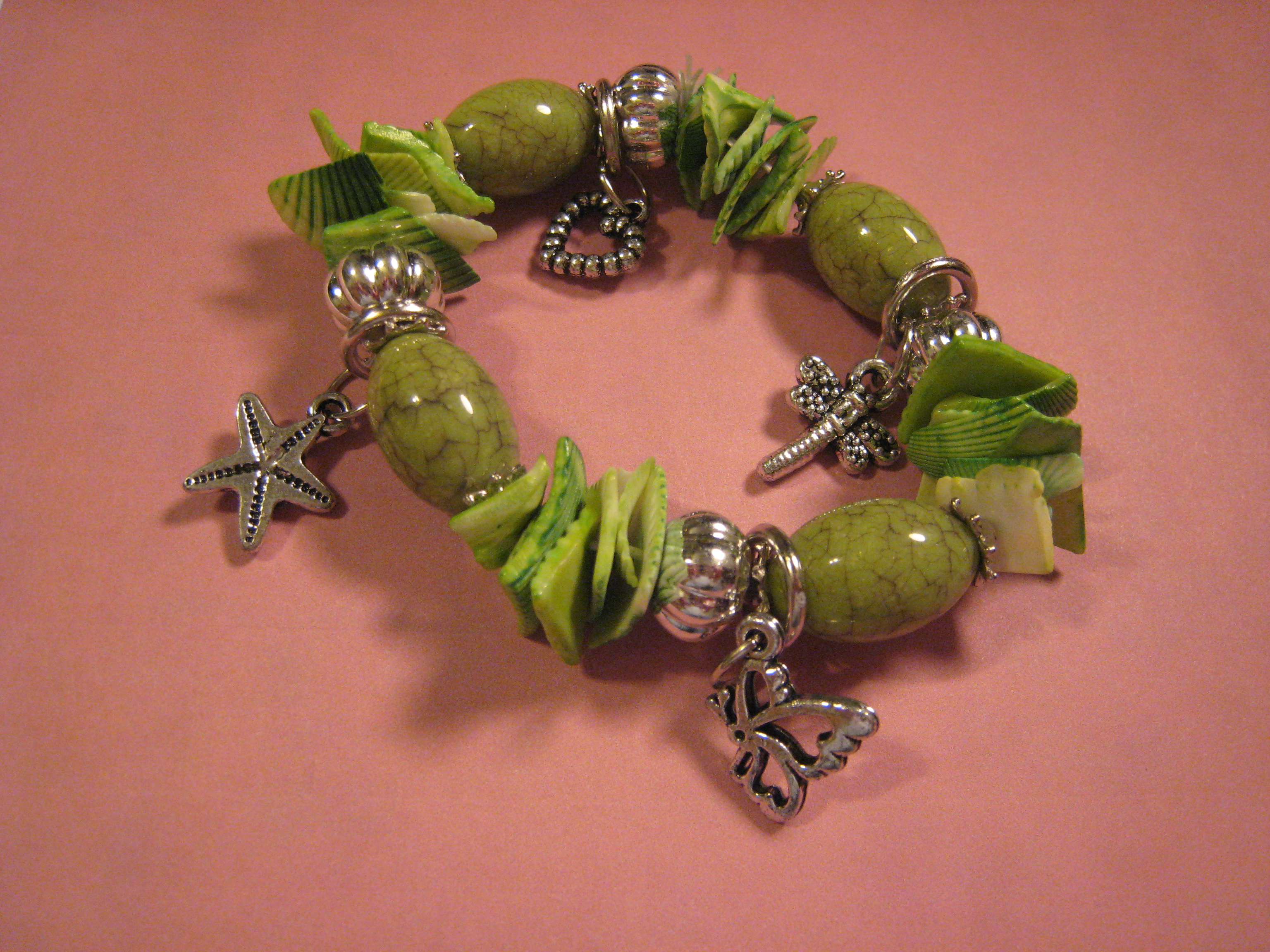 Cute bracelet with silver alloy charms, green acrylic beads and shell accents.