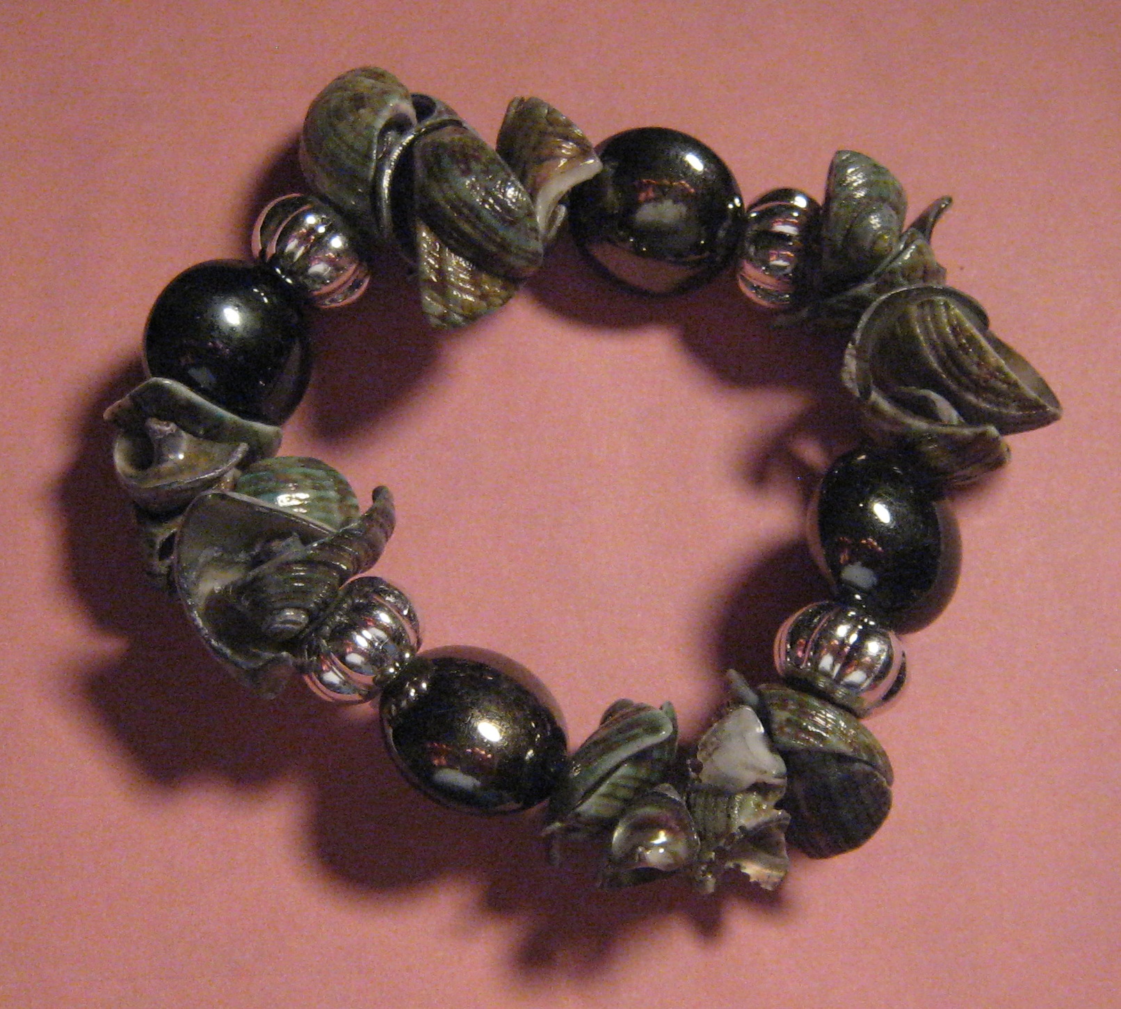 Cute bracelet with silver alloy charms, green acrylic beads and shell accents.