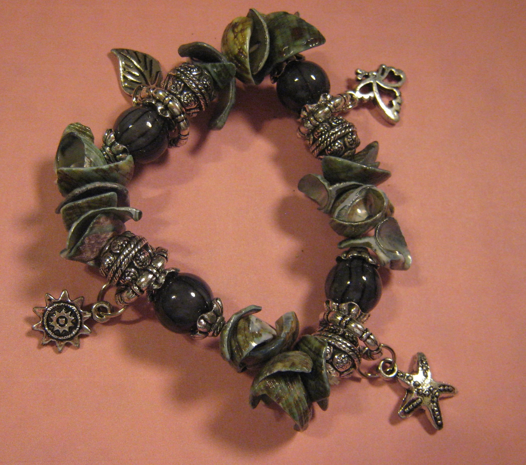 Cute bracelet with silver alloy charms, green acrylic beads and shell accents.