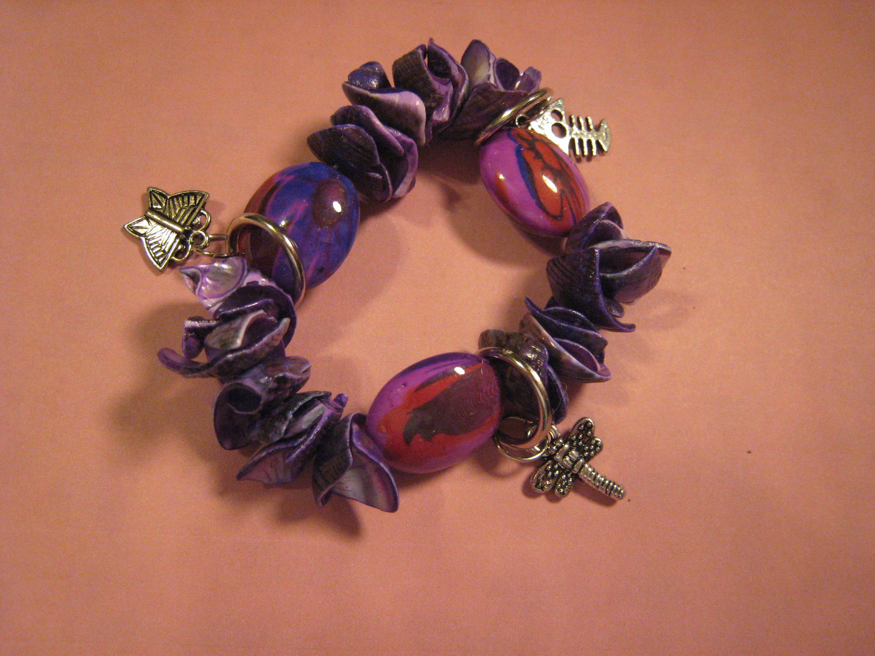 Cute bracelet with silver alloy charms, purple acrylic beads and shell accents.