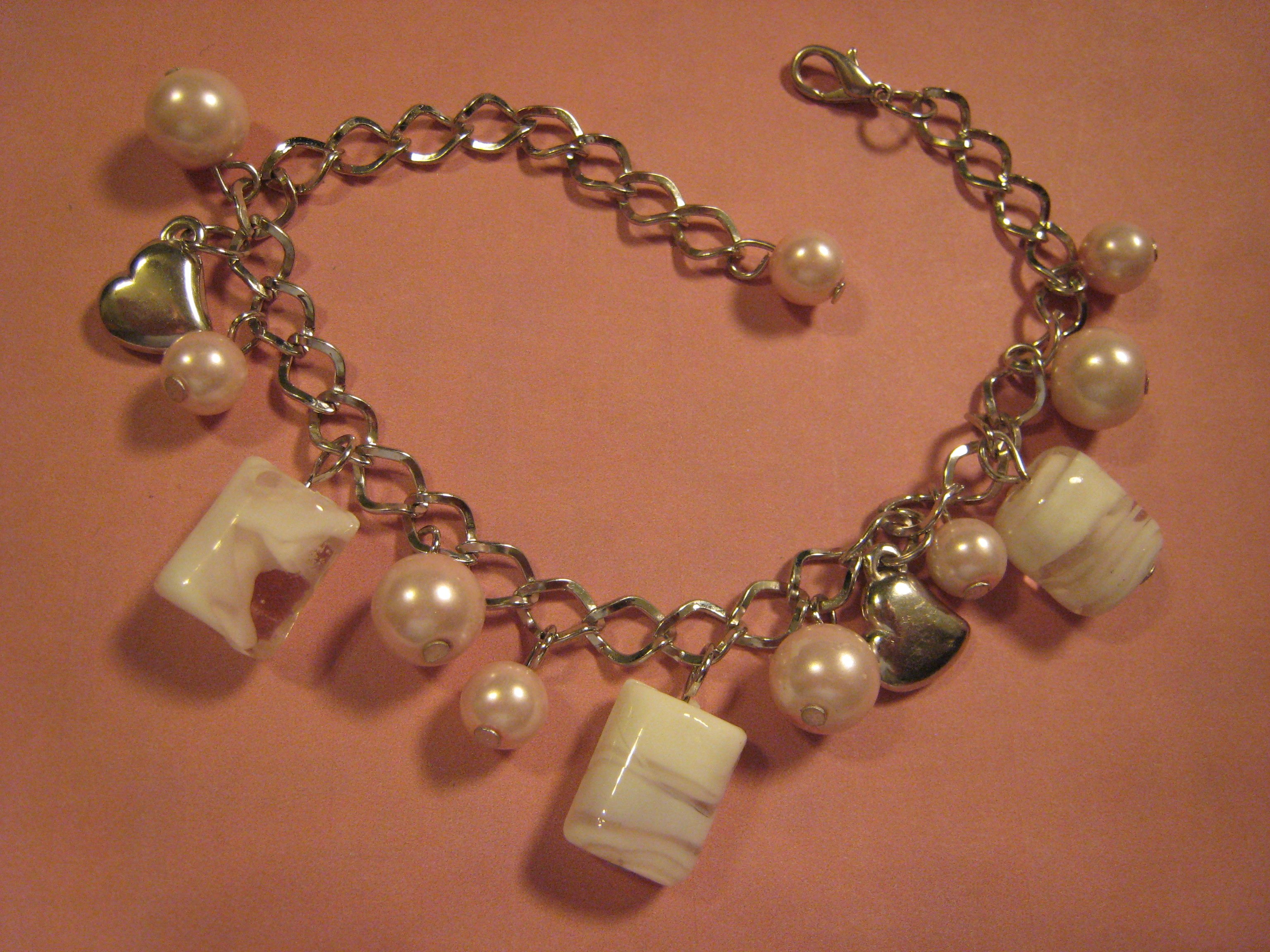 White and pink swirled Murano glass, pearl colored beads and heart shaped charms make up this beautiful adjustable 9 1/2 Inch bracelet.