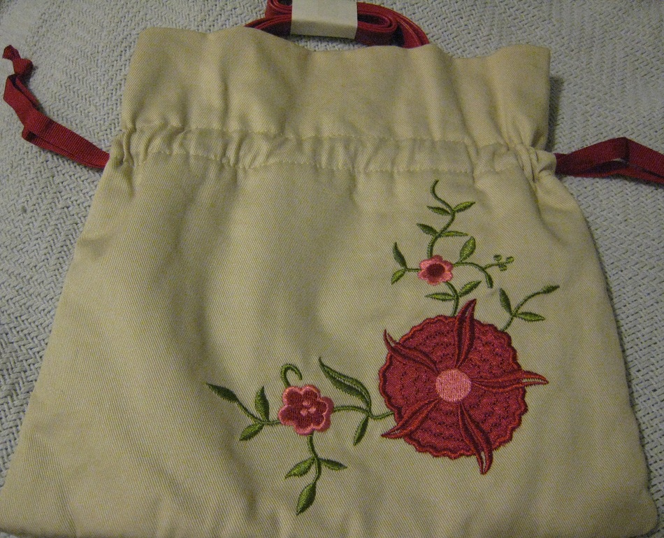 Beautiful cotton khaki/tan colored purse with embroidered floral accents. Cinch closure, measures 9 1/2" x 7 1/2"