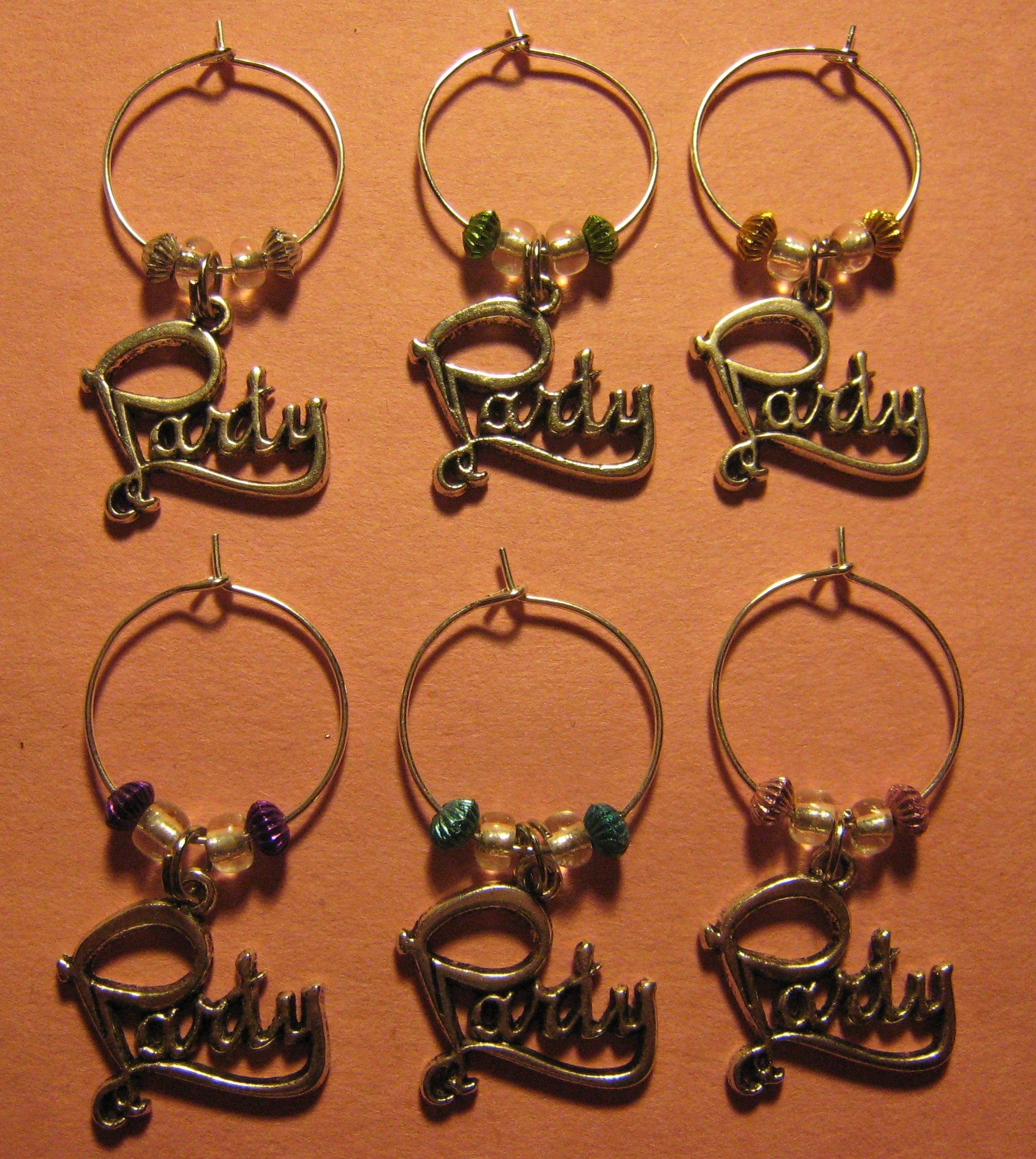 Each set includes 6 metal wine charms with plastic/acrylic beads packaged in a fabric pouch with a card reading: