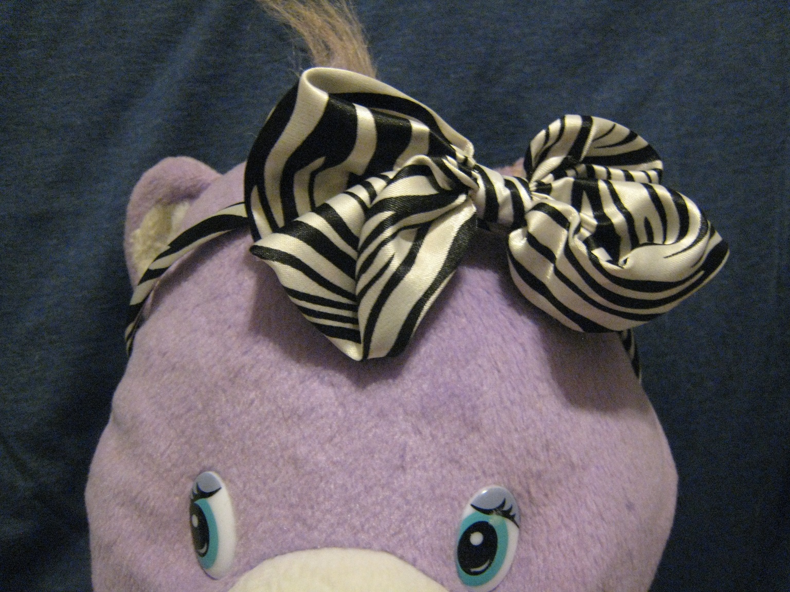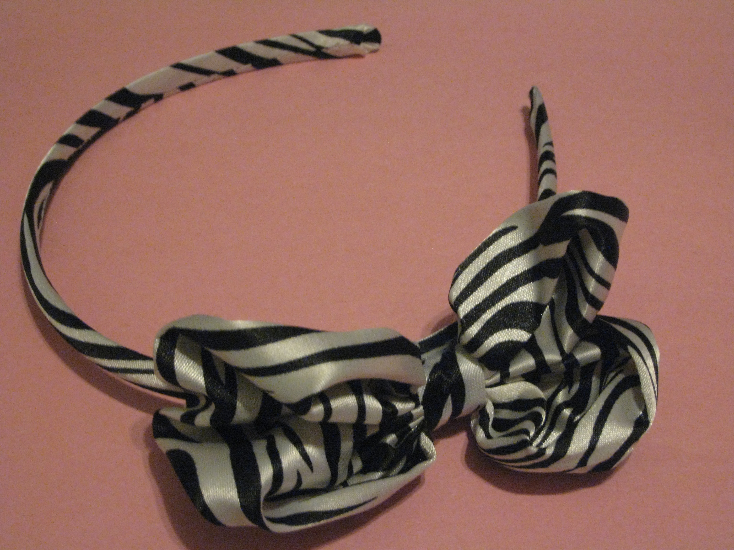 Bow measures 4" across and is secured to headband with hot glue and felt.