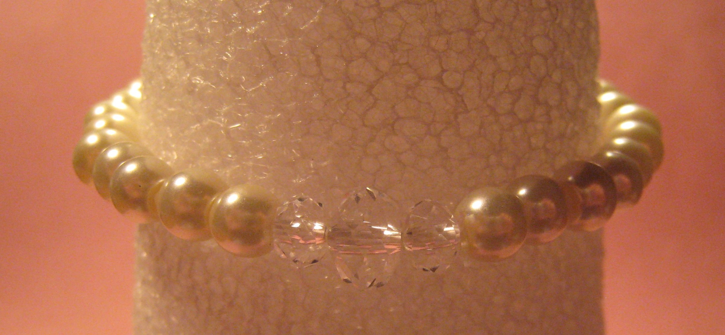 6mm Cultura Glass Pearls and 3 faceted assorted crystals adorn this pretty stretchy bracelet.