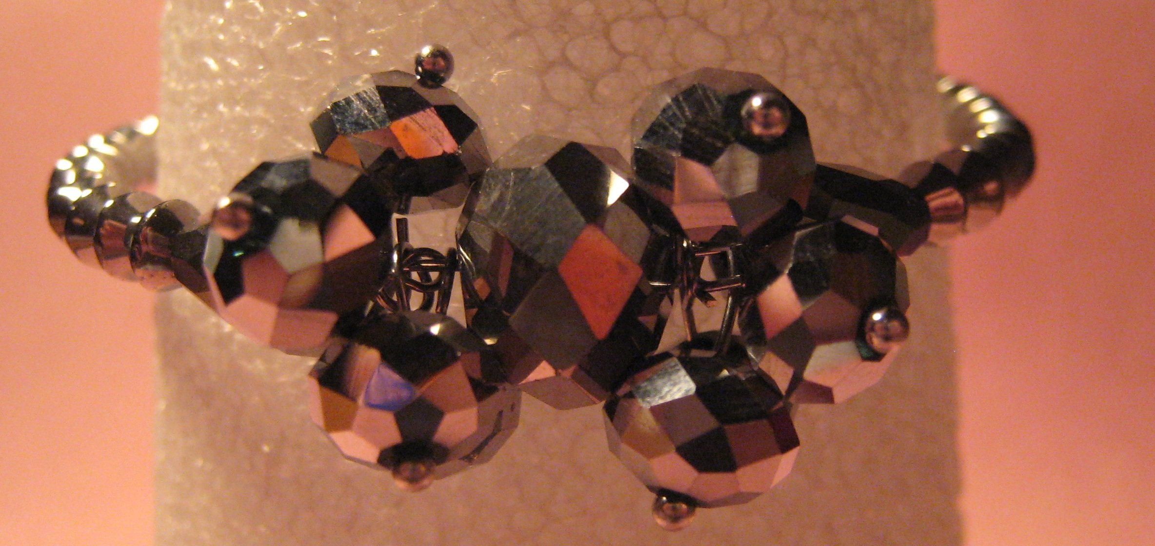 Beautifully done adjustable size memory wire bracelet made out of stainless steel and assorted crystals such as Celestial Crystal (wrist) Celestial Crystal and Czech Glass & Swarovski(focal center). The smallest crystals around the bracelet measure 4mm and the largest center one measures 9mm.