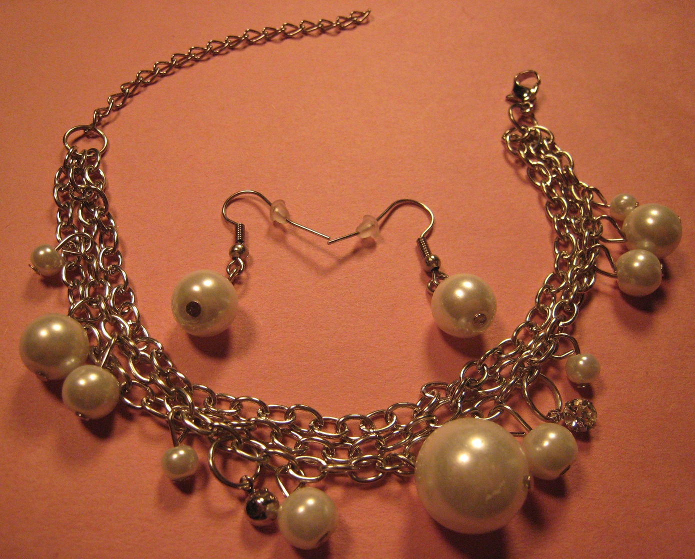 Assorted sized Cultura Glass Pearls alongside little rhinestone charms dangle from one of 3 connected chains.