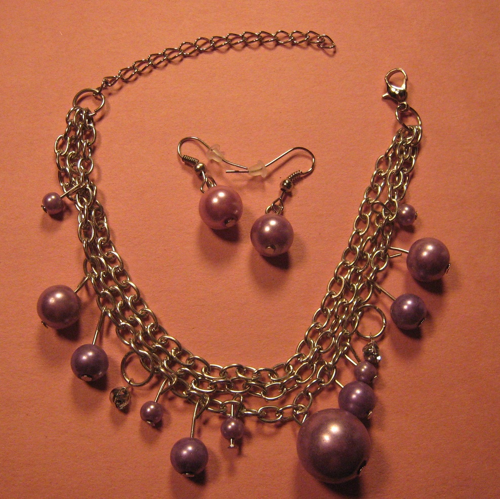 Assorted sized Cultura Glass Pearls alongside little rhinestone charms dangle from one of 3 connected chains.