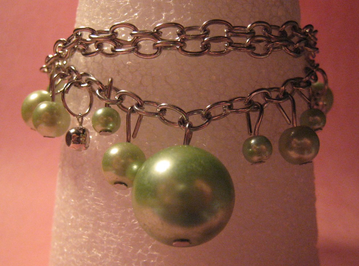 Assorted sized Cultura Glass Pearls alongside little rhinestone charms dangle from one of 3 connected chains.