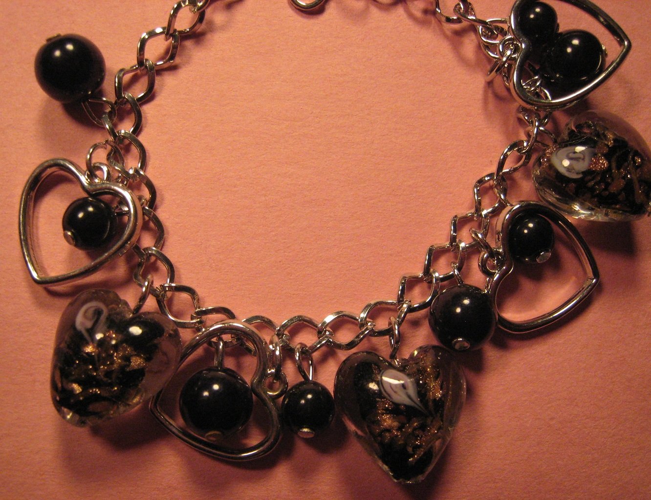 Clear with a black center, white and gold foiled swirled Murano glass, black colored beads with heart shaped charms make up this beautiful adjustable 9 1/2 Inch bracelet.