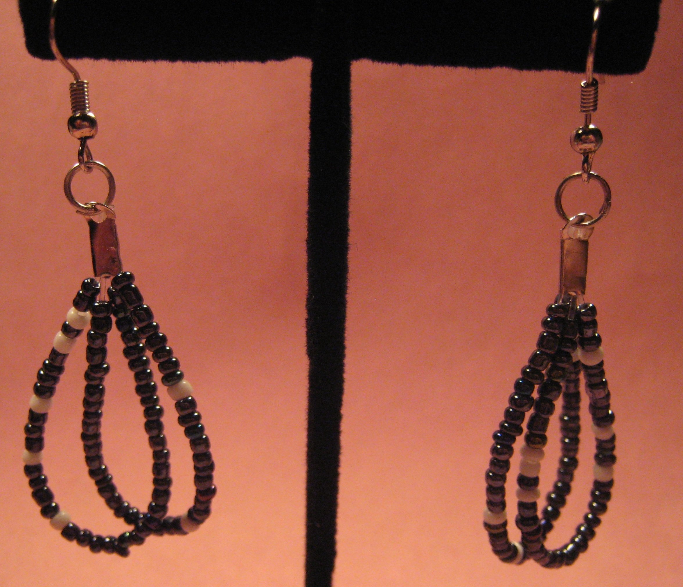 Strung black, ab black & white seed beads hung in 2 loops and finished with a plated crimp bead attached to a metal fish hook pierced ear wire. Earrings are approximately 2" long.