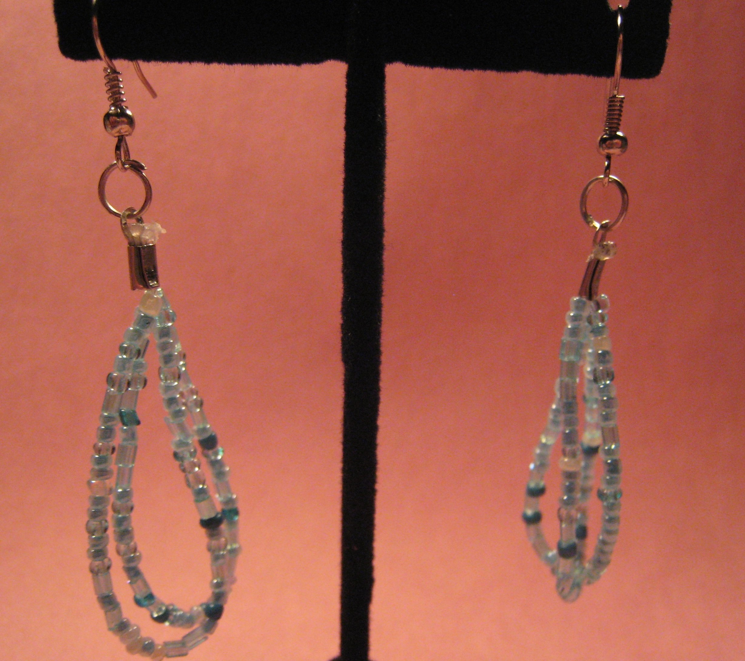 Strung teal, clear & opalescent seed beads with teal ab seed tubes hung in 2 loops and finished with a plated crimp bead attached to a metal fish hook pierced ear wire. Earrings are approximately 2" long.