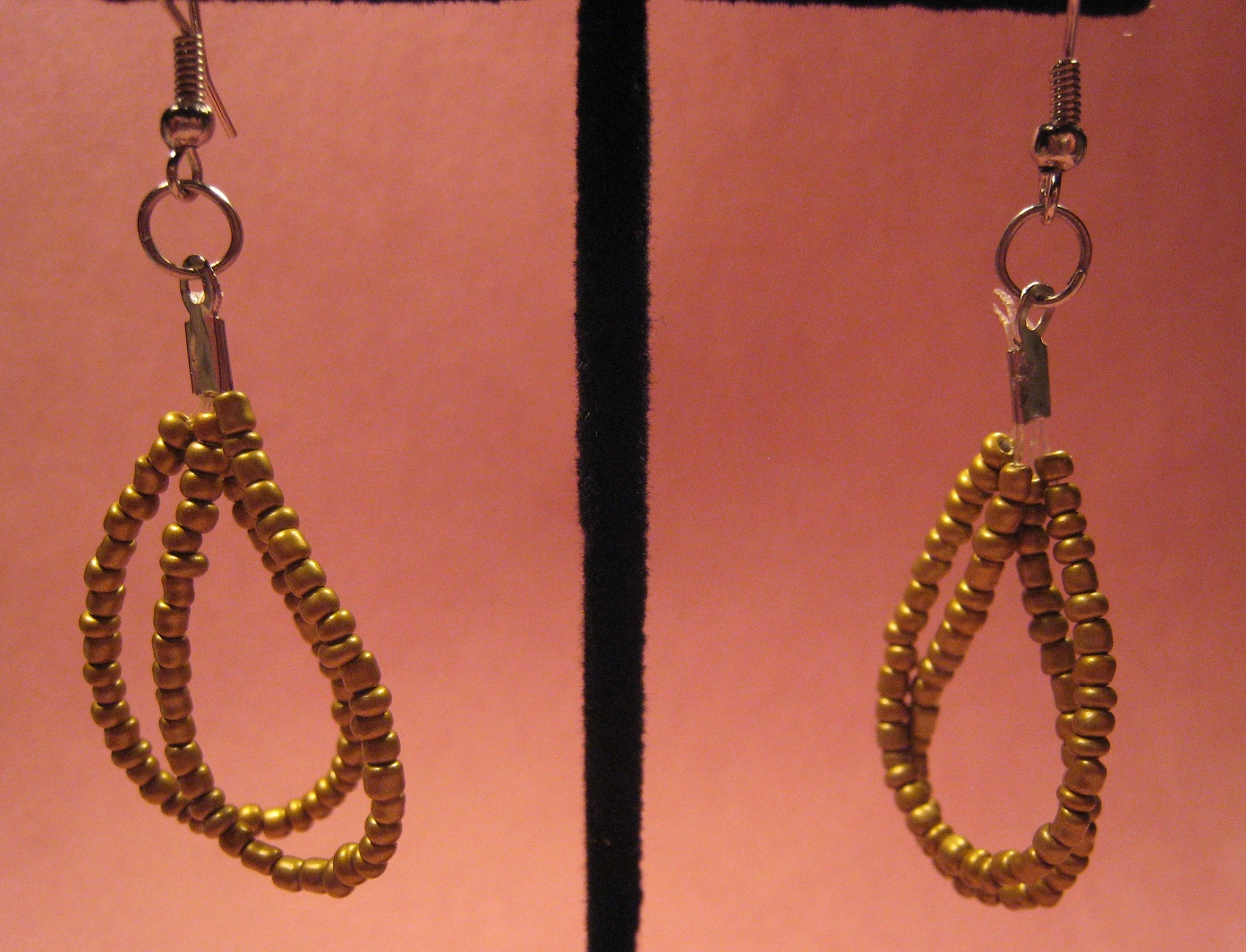 Strung matte gold seed beads hung in 2 loops and finished with a plated crimp bead attached to a metal fish hook pierced ear wire. Earrings are approximately 2" long.