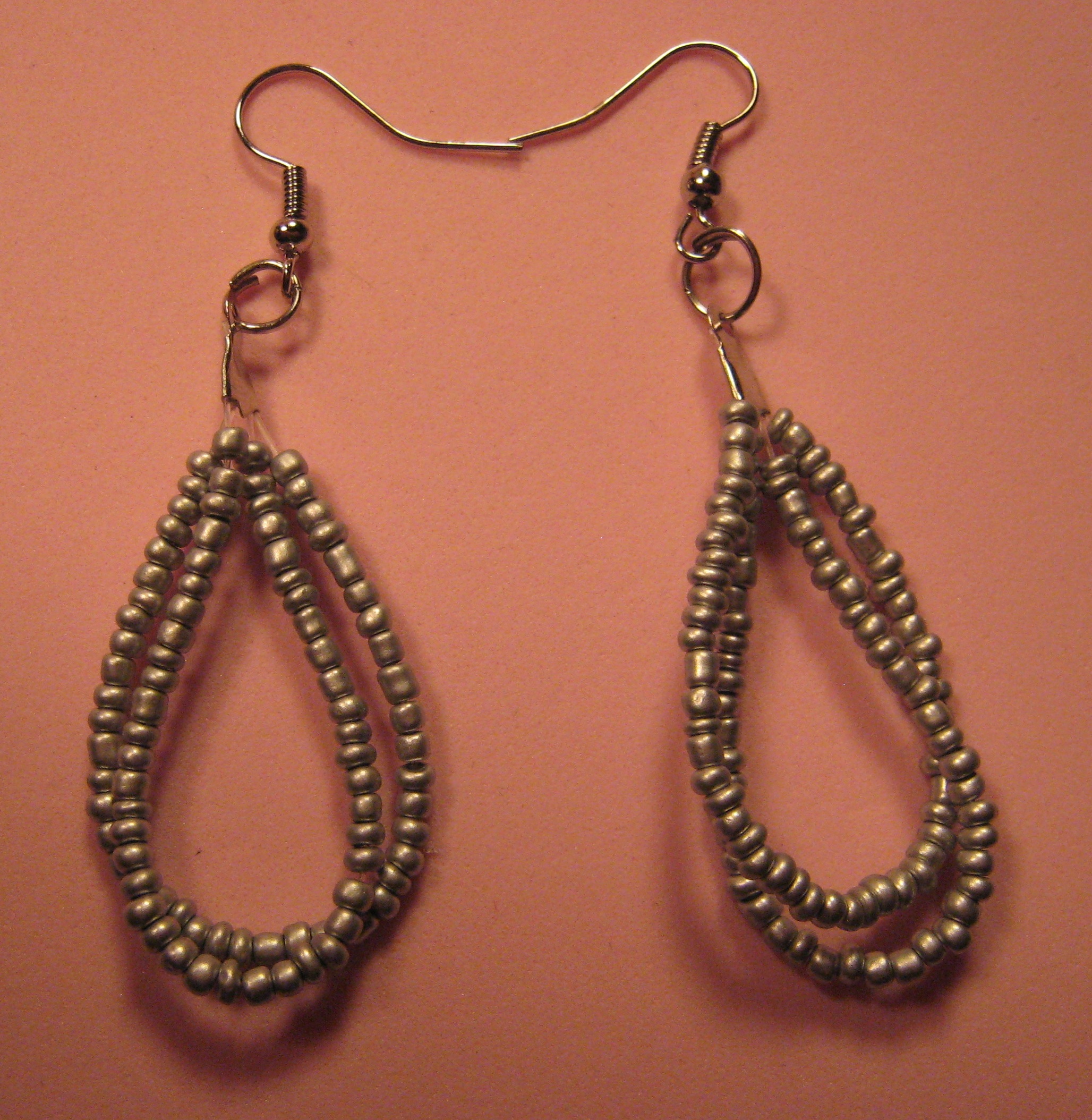Strung matte silver seed beads hung in 2 loops and finished with a plated crimp bead attached to a metal fish hook pierced ear wire. Earrings are approximately 2" long.
