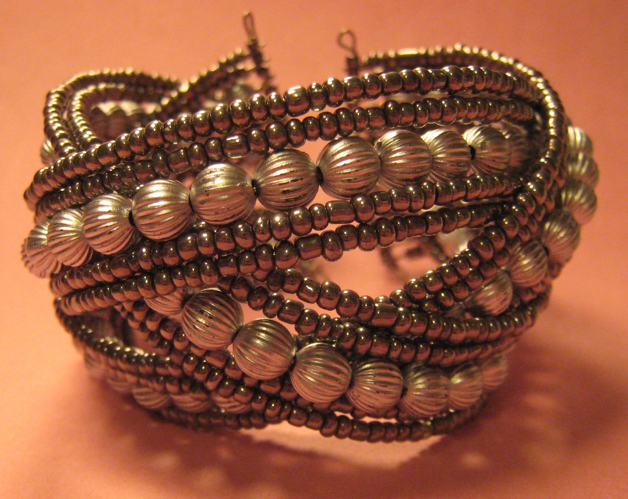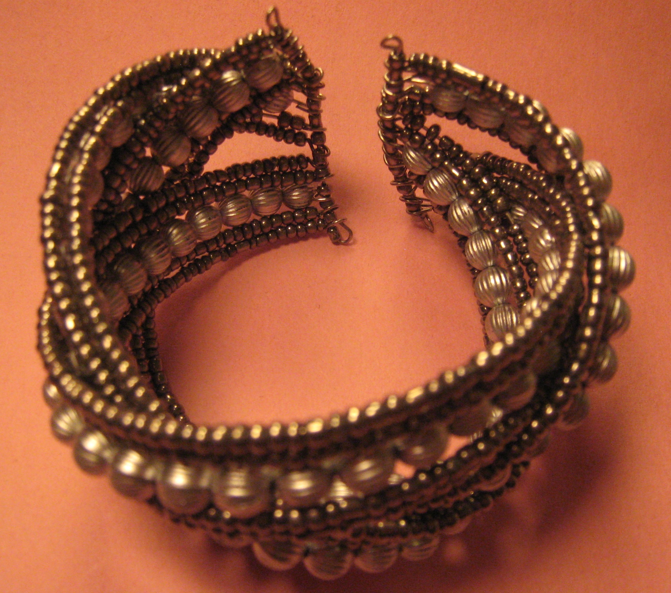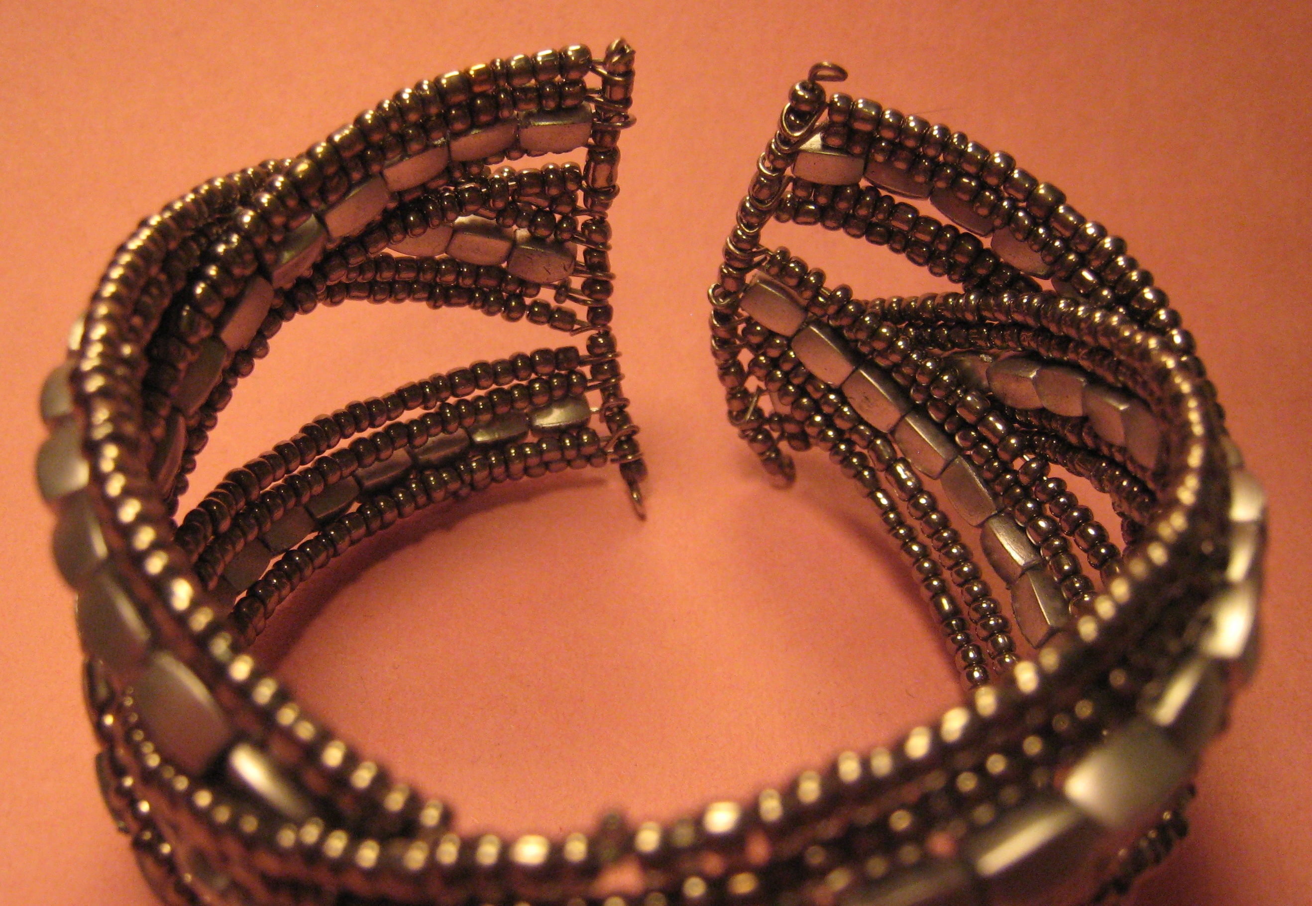 Made out of glass seed beads and acrylic beads strung on steel wire and looped through. Wire is bendable to fit all wrist sizes and retracts back to its cuff shape.