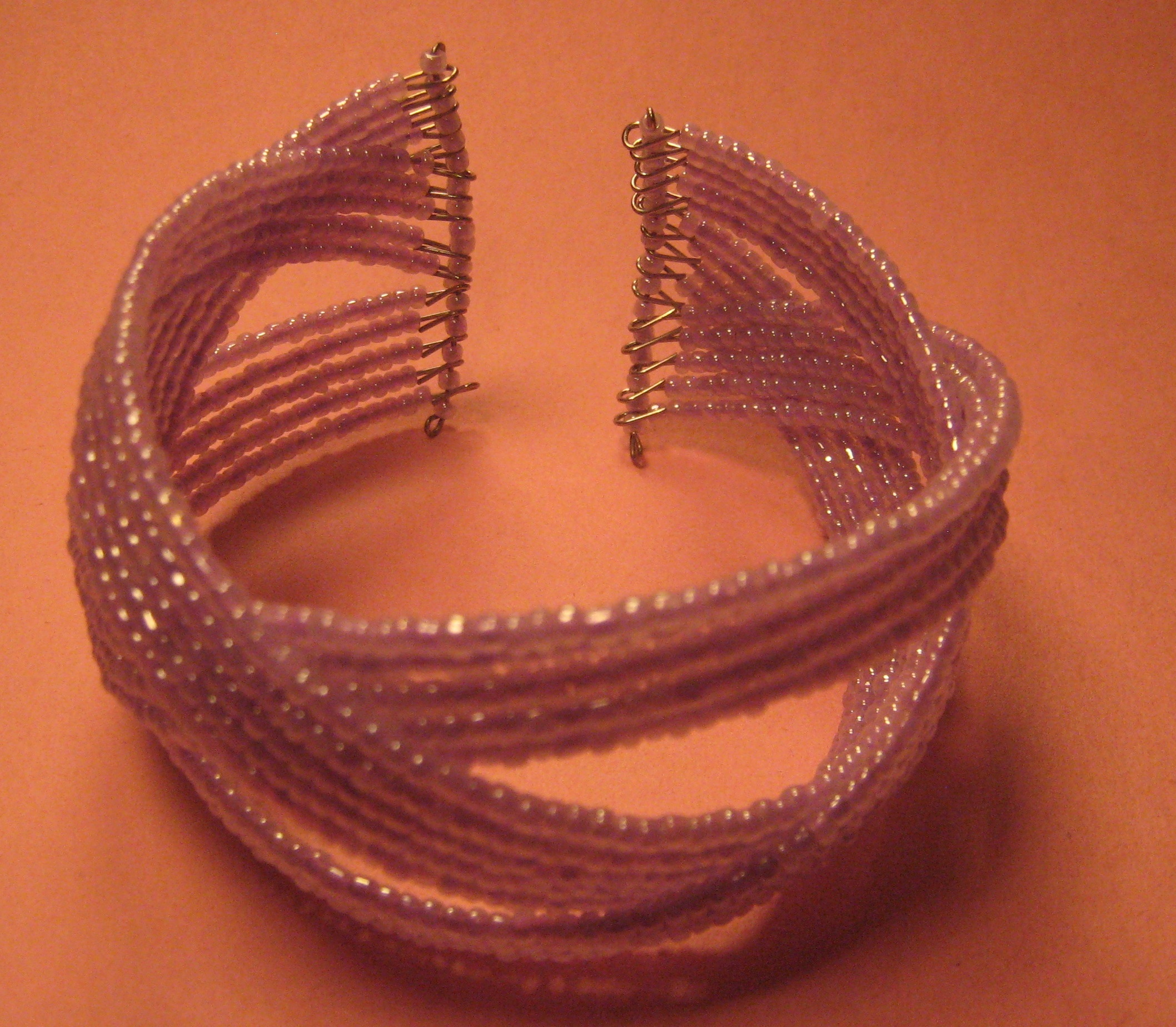 Made out of glass seed beads and acrylic beads strung on steel wire and looped through. Wire is bendable to fit all wrist sizes and retracts back to its cuff shape.