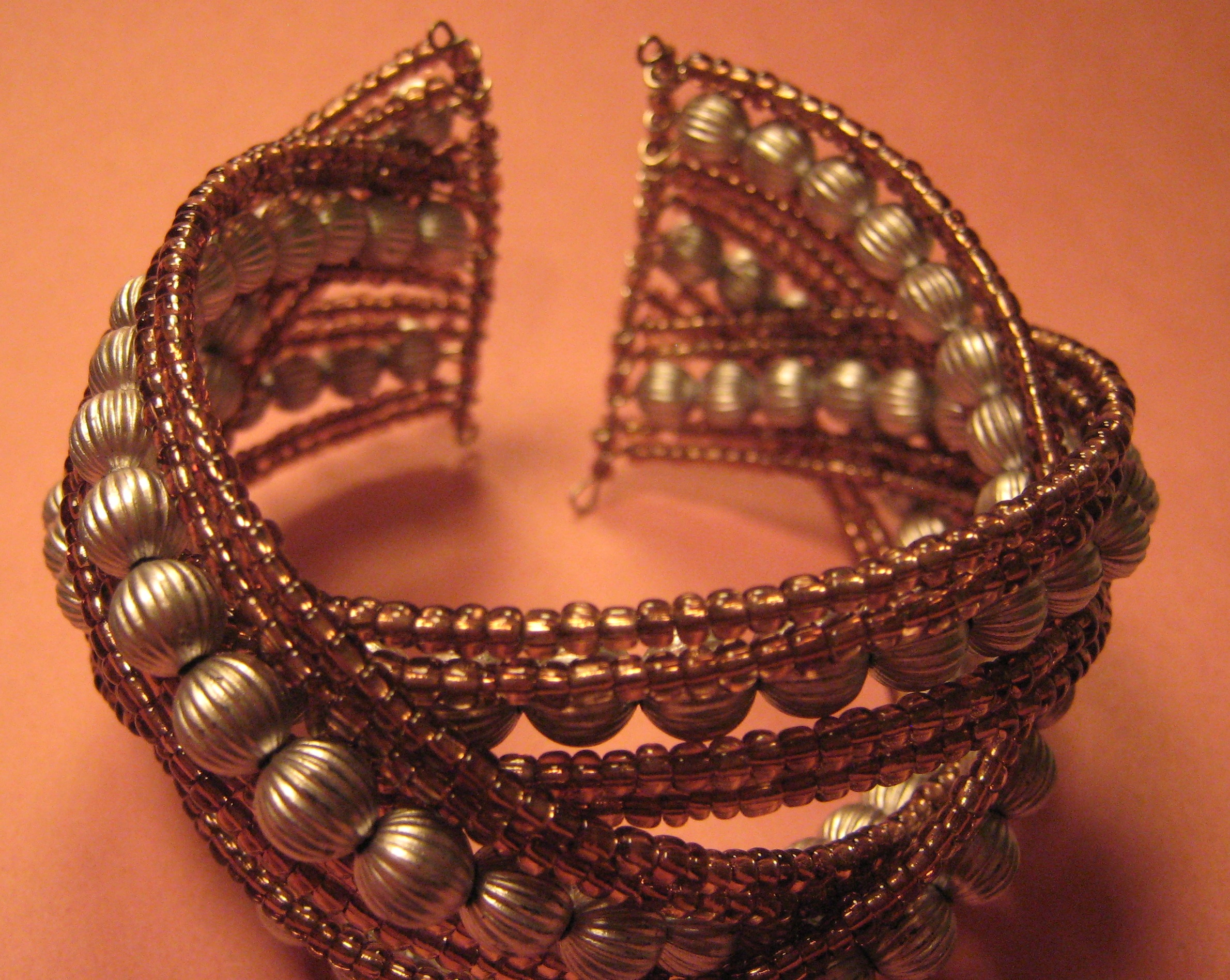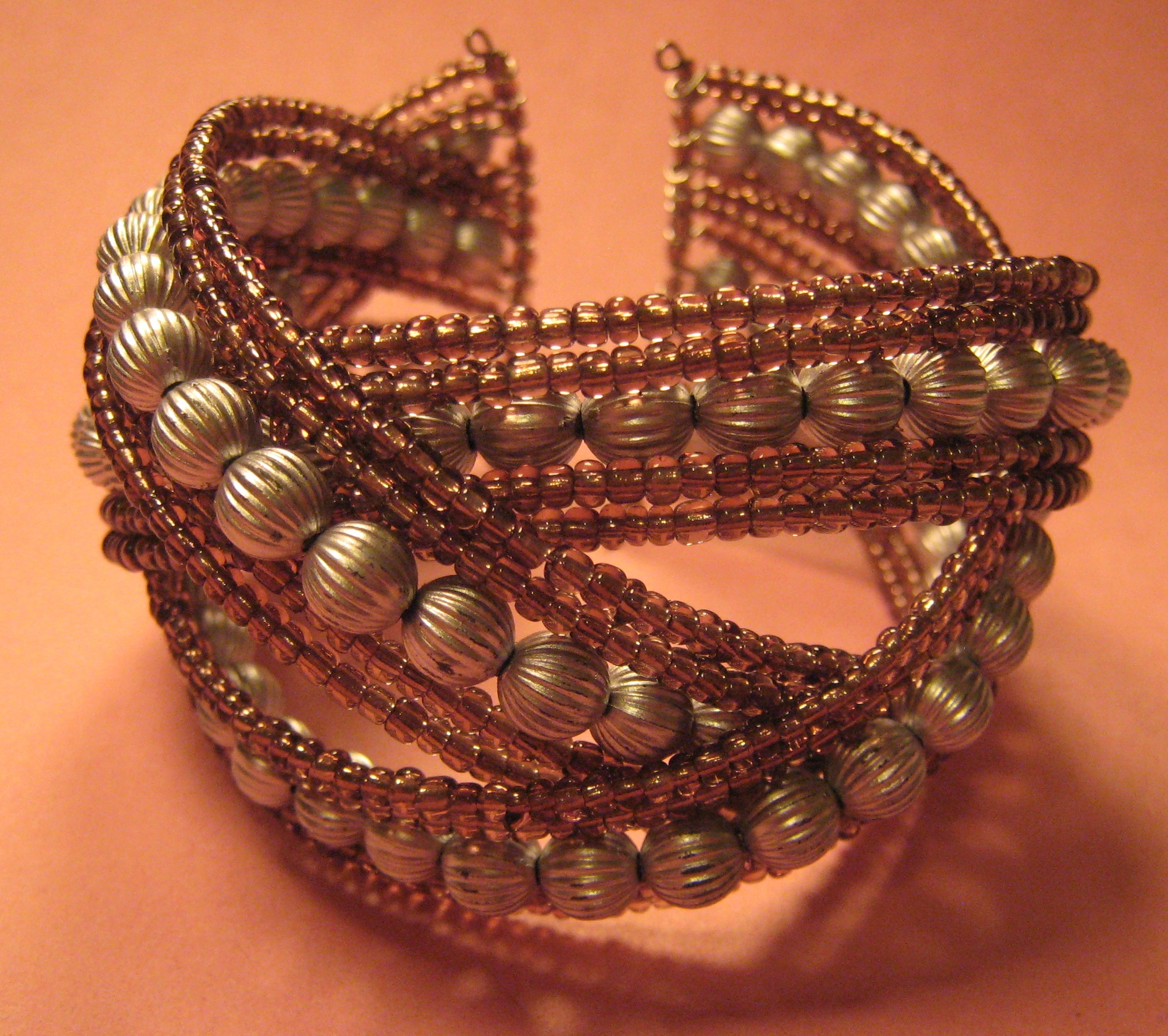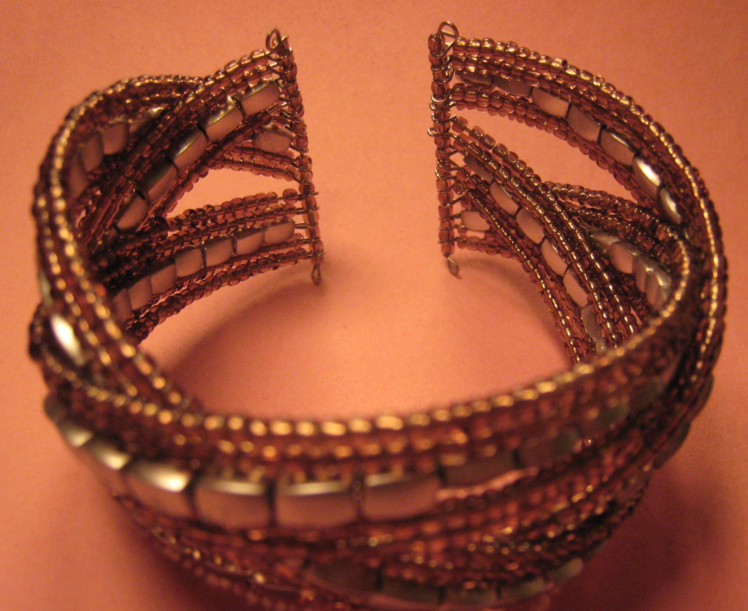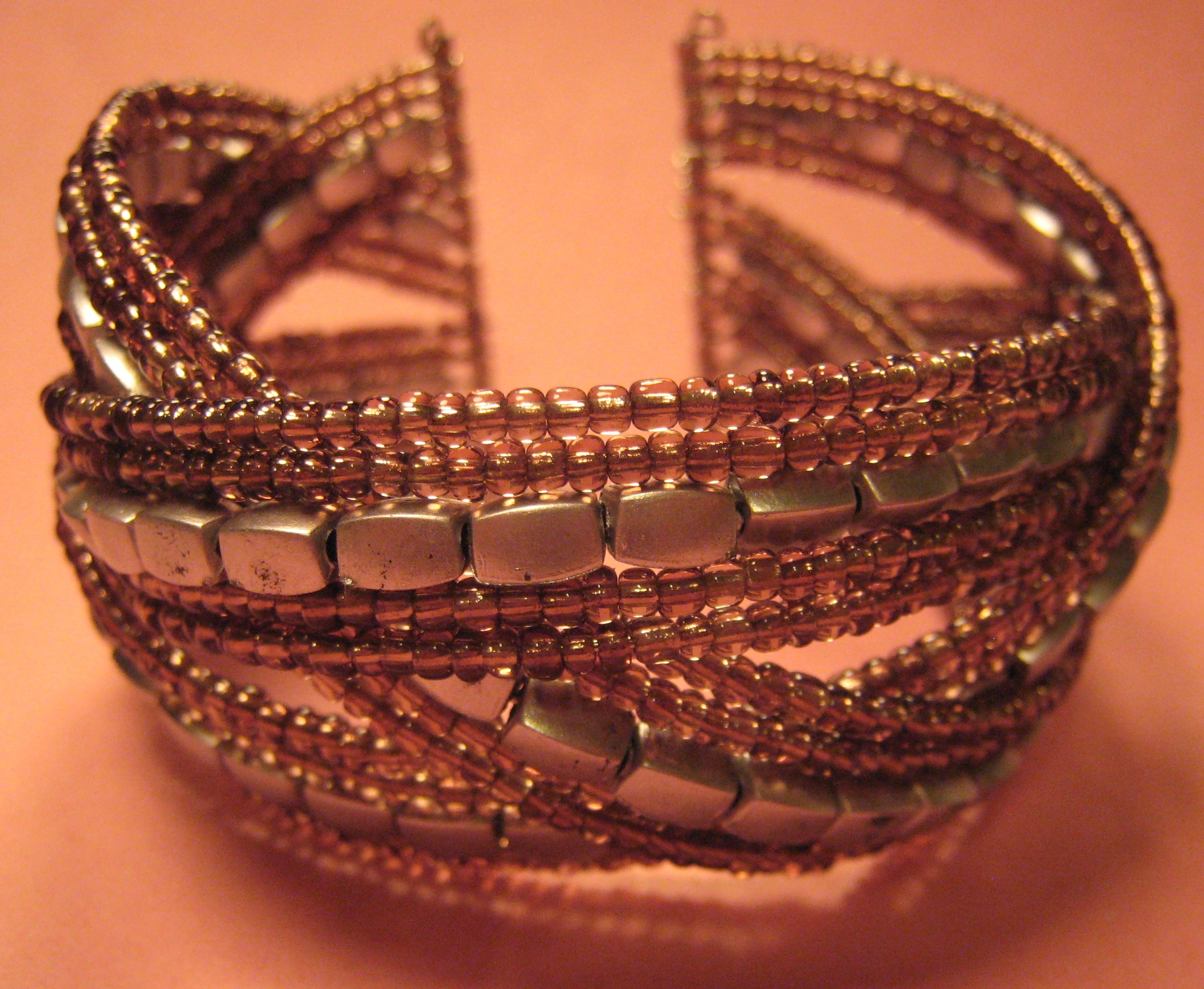Made out of glass seed beads and acrylic beads strung on steel wire and looped through. Wire is bendable to fit all wrist sizes and retracts back to its cuff shape.