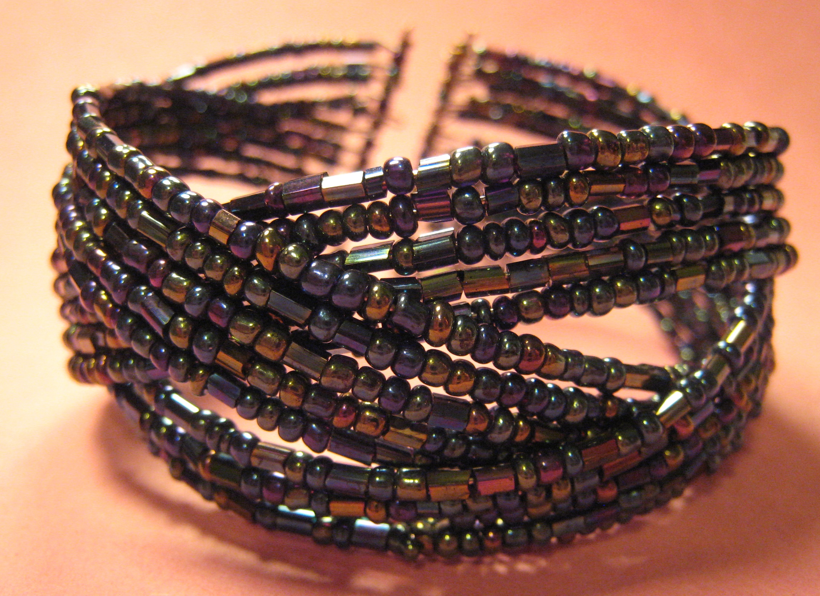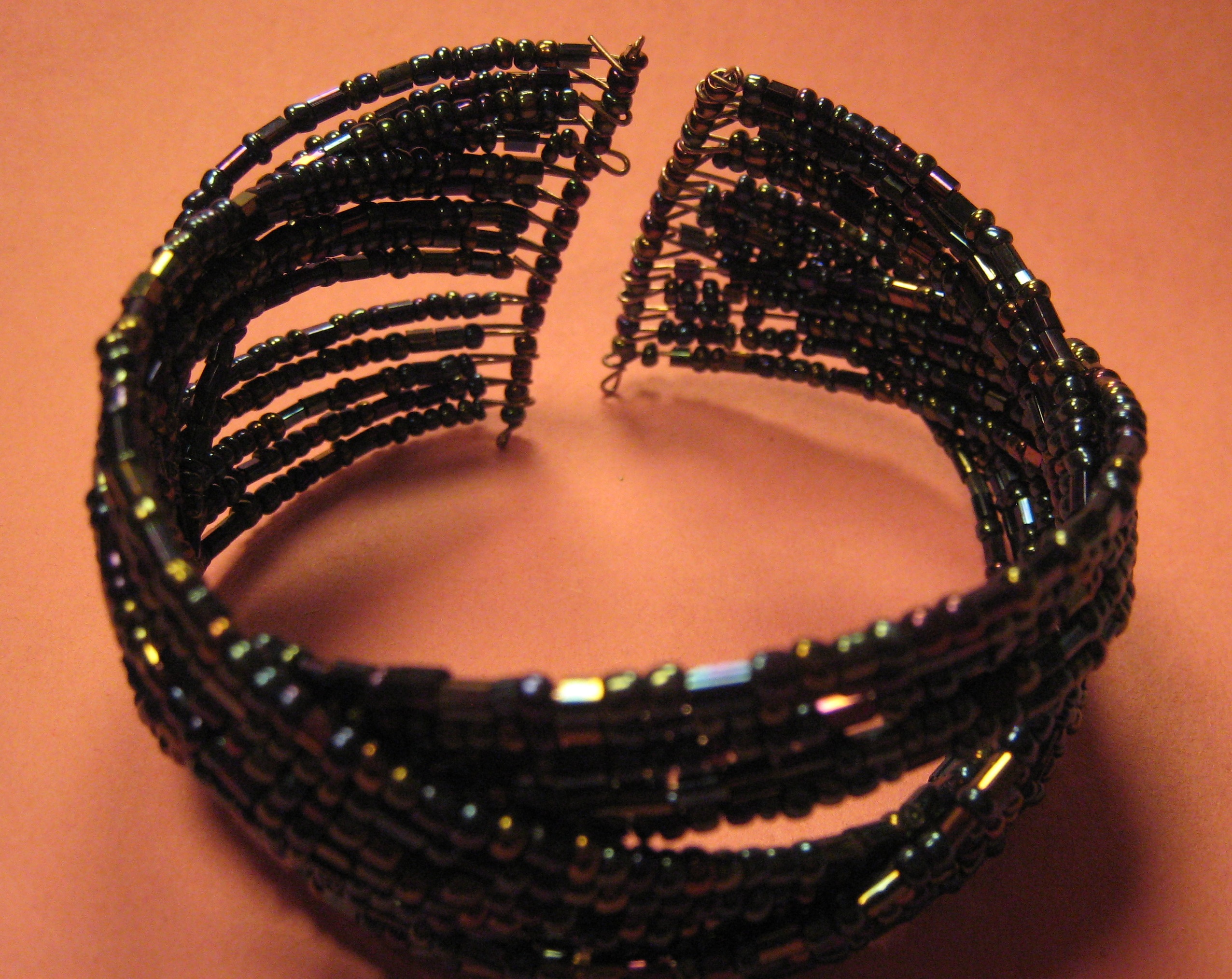 Made out of glass seed beads and seed tubes strung on steel wire and looped through. Wire is bendable to fit all wrist sizes and retracts back to its cuff shape.