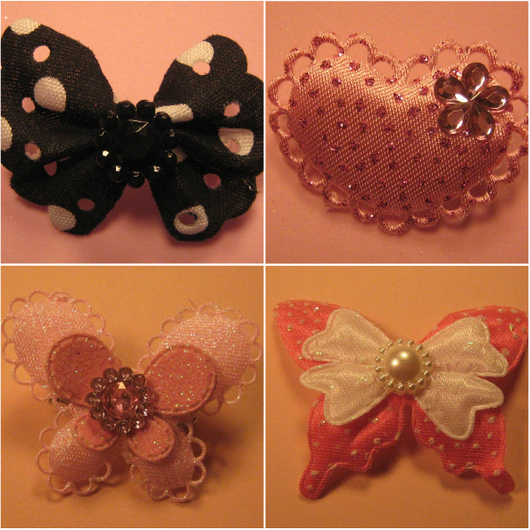 Tiny polka dotted bow with an embellishment in the center. Measures 1 1/2" and has a locking pin backing.