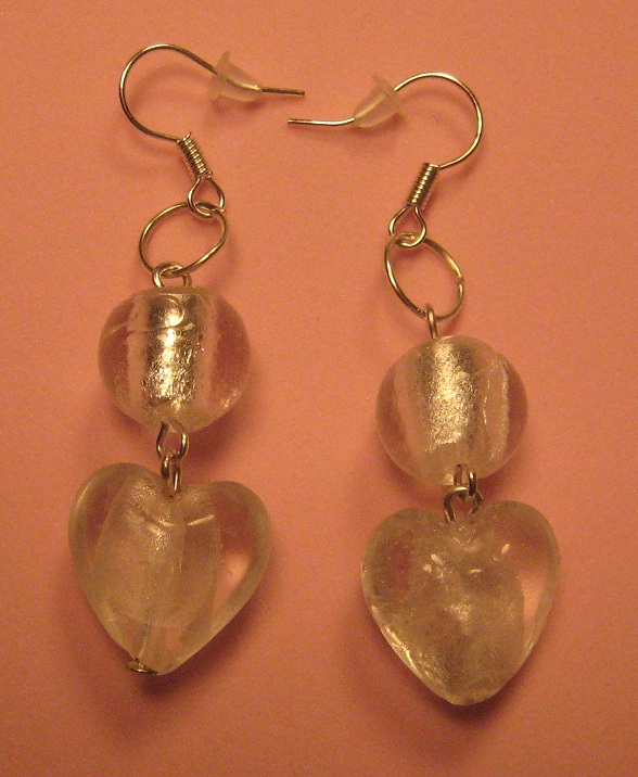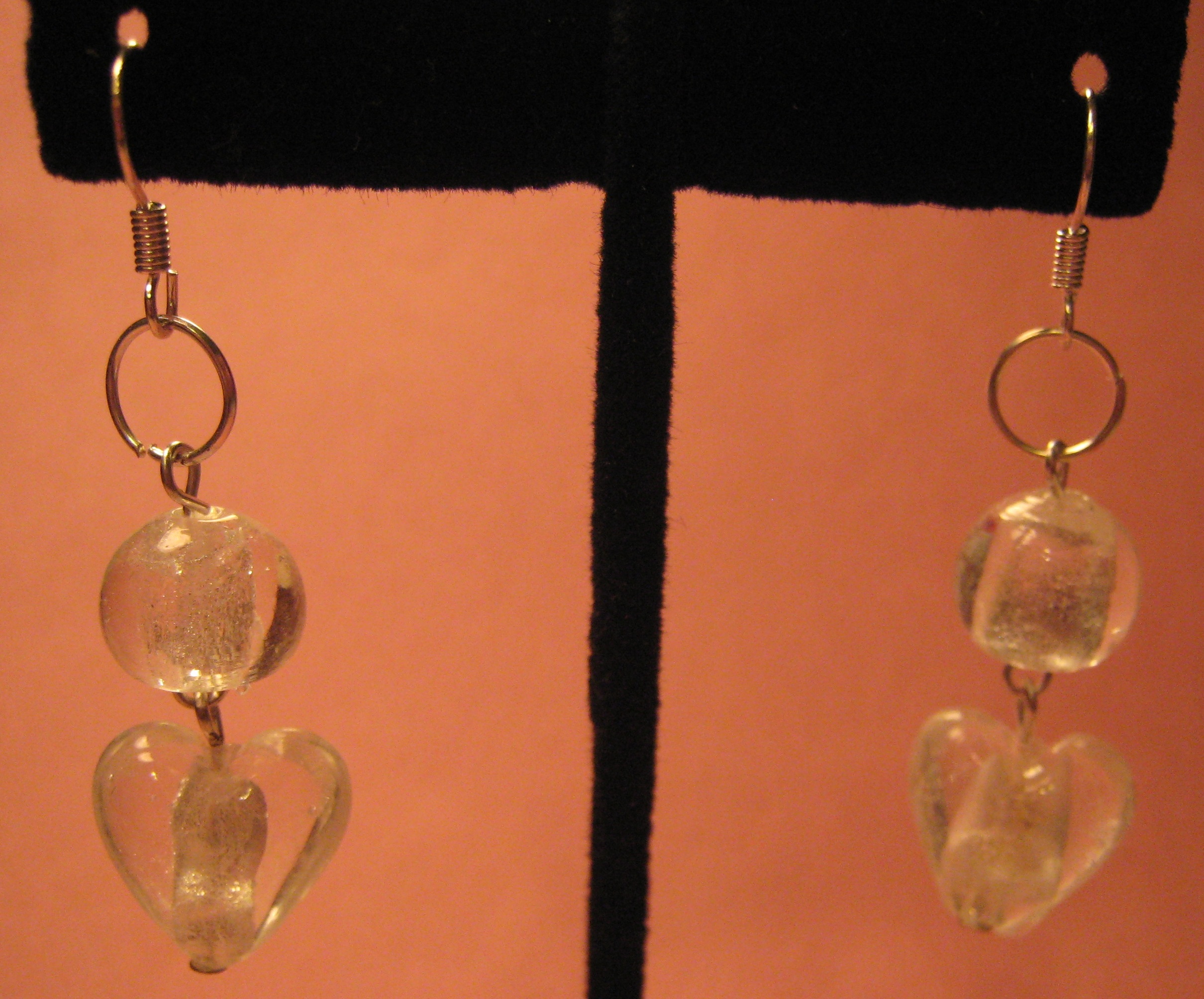 Silver foil lined transparent lampwork glass rounds and hearts make up these cute earrings which measure 2" and have a steel fish hook earwire.