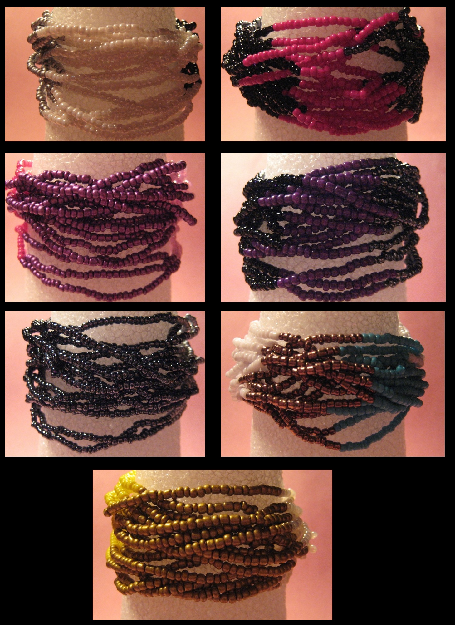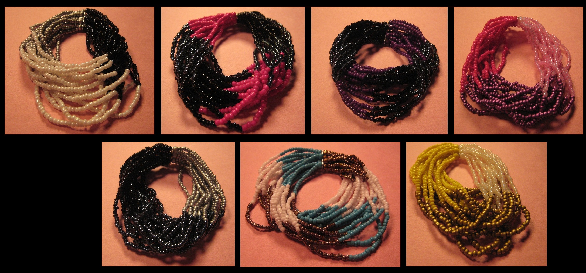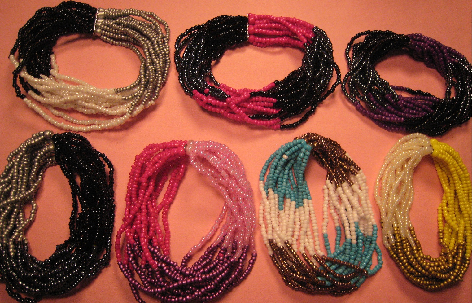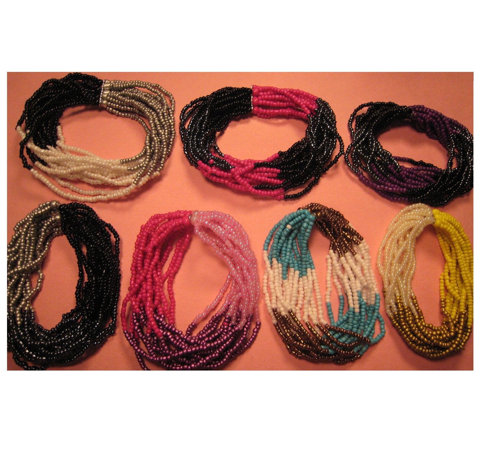 Multiple rows of colored seed beads strung on stretchy cording with connector piece to hold it all together.