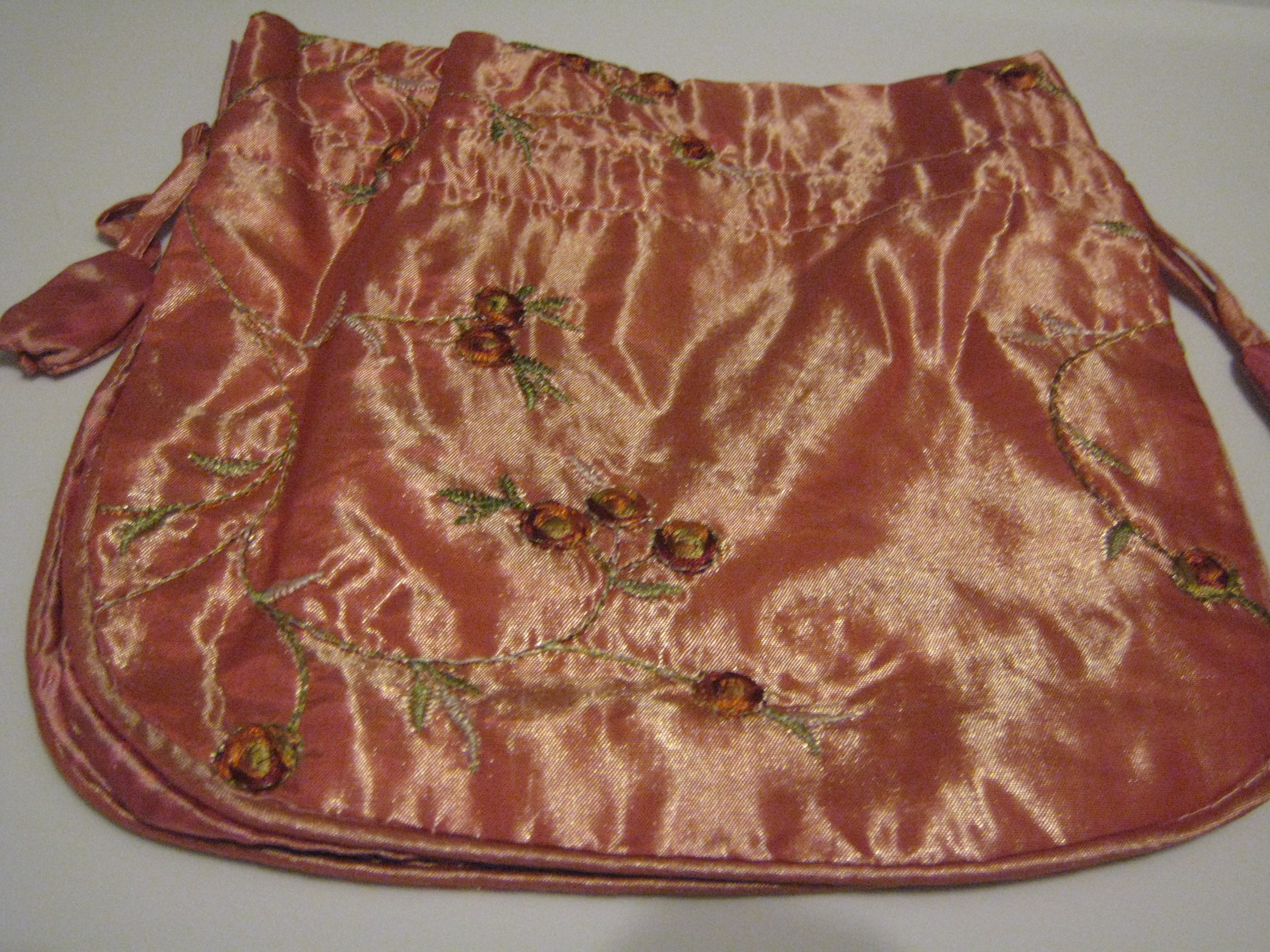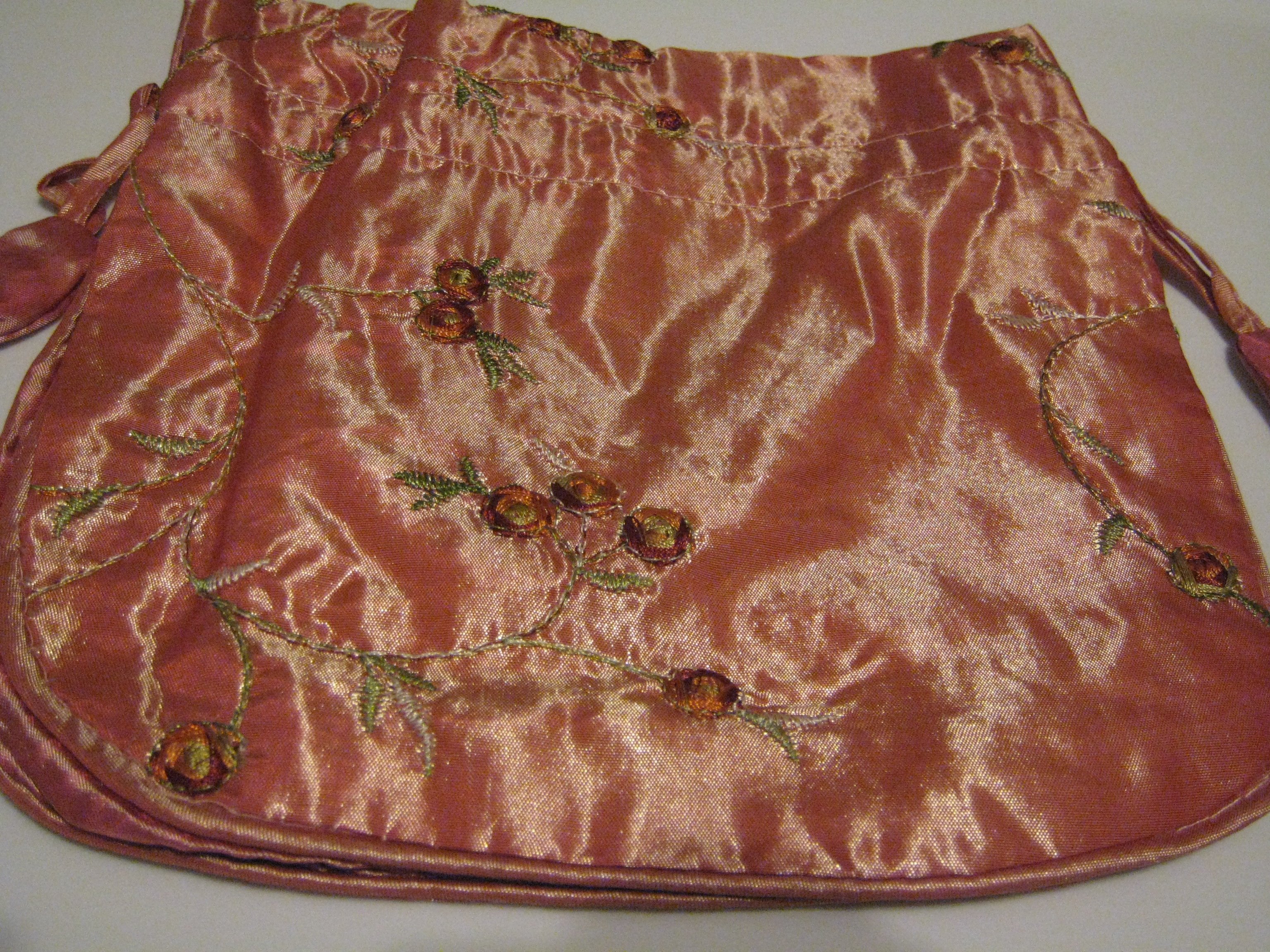 Hand done embroidery in a beautiful soft pink fabric. Cinch closure. Measures 8"X8"X2"