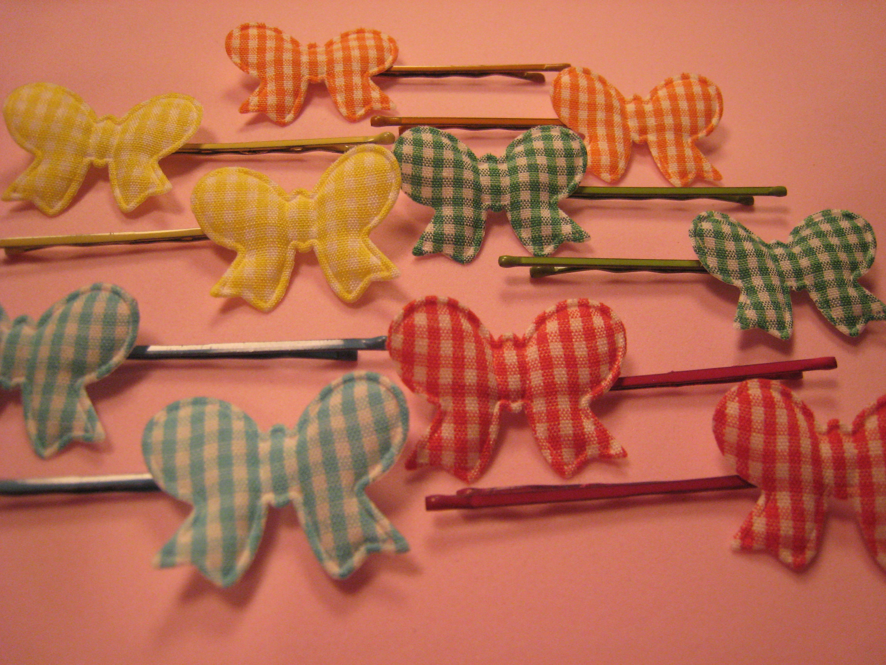 Cute tiny gingham bows hot glued on to a matching colored bobby pin. The clips measure just over 2"L. Comes in a set of 2, one clip facing each way.