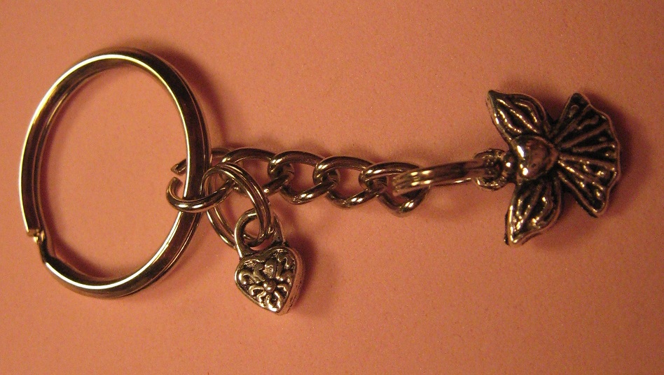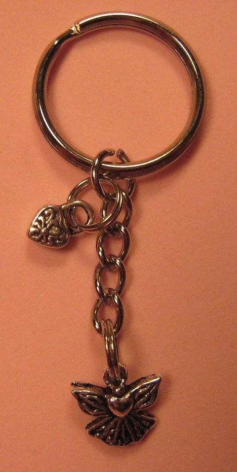 Metal key chain measuring 2 1/2" adorned with a pewter heart charm and a pewter angel shaped dangle charm.