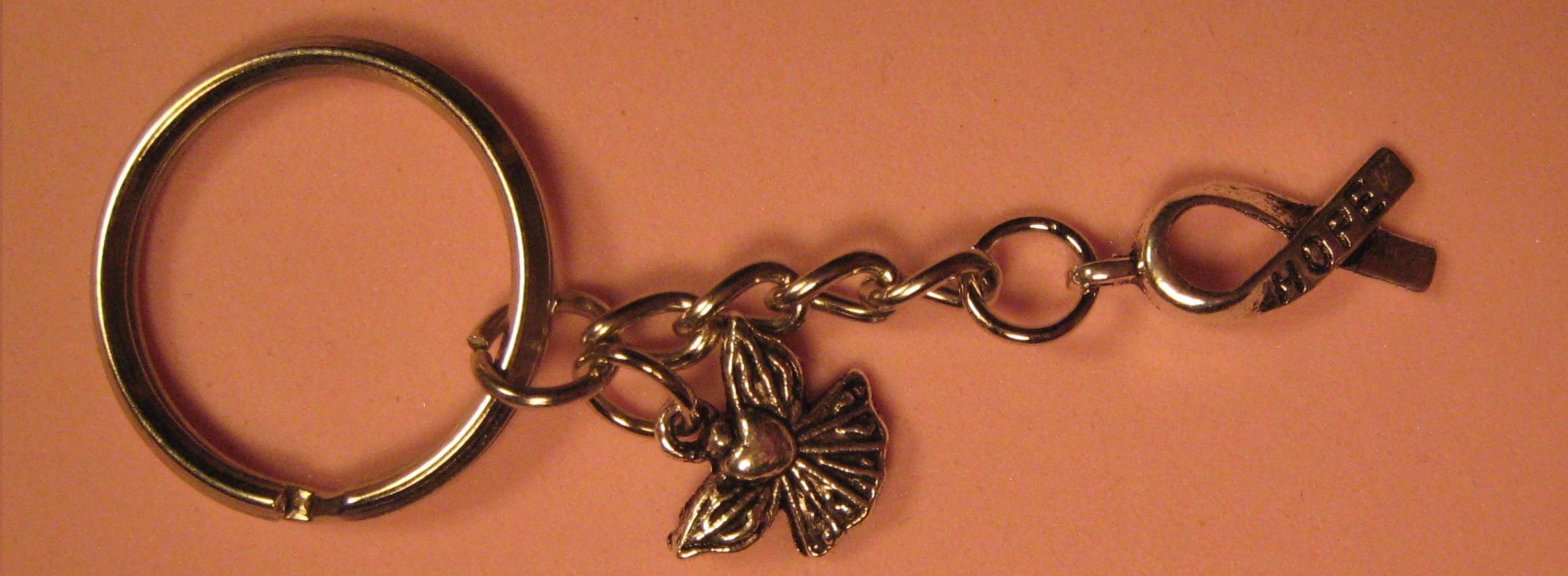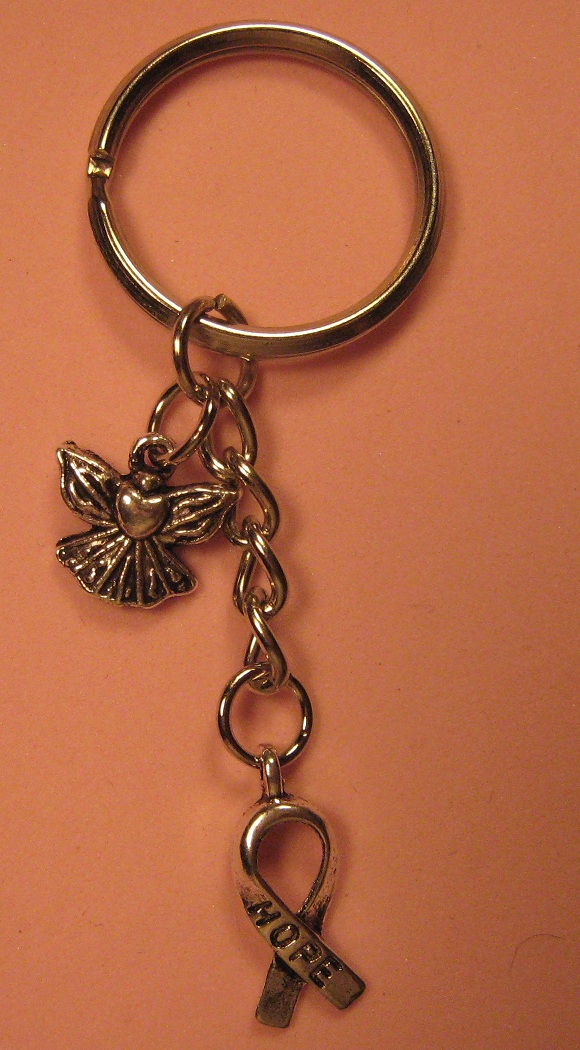 Metal key chain measuring 2 1/2" adorned with a pewter angel charm and a pewter hope ribbon shaped dangle charm.