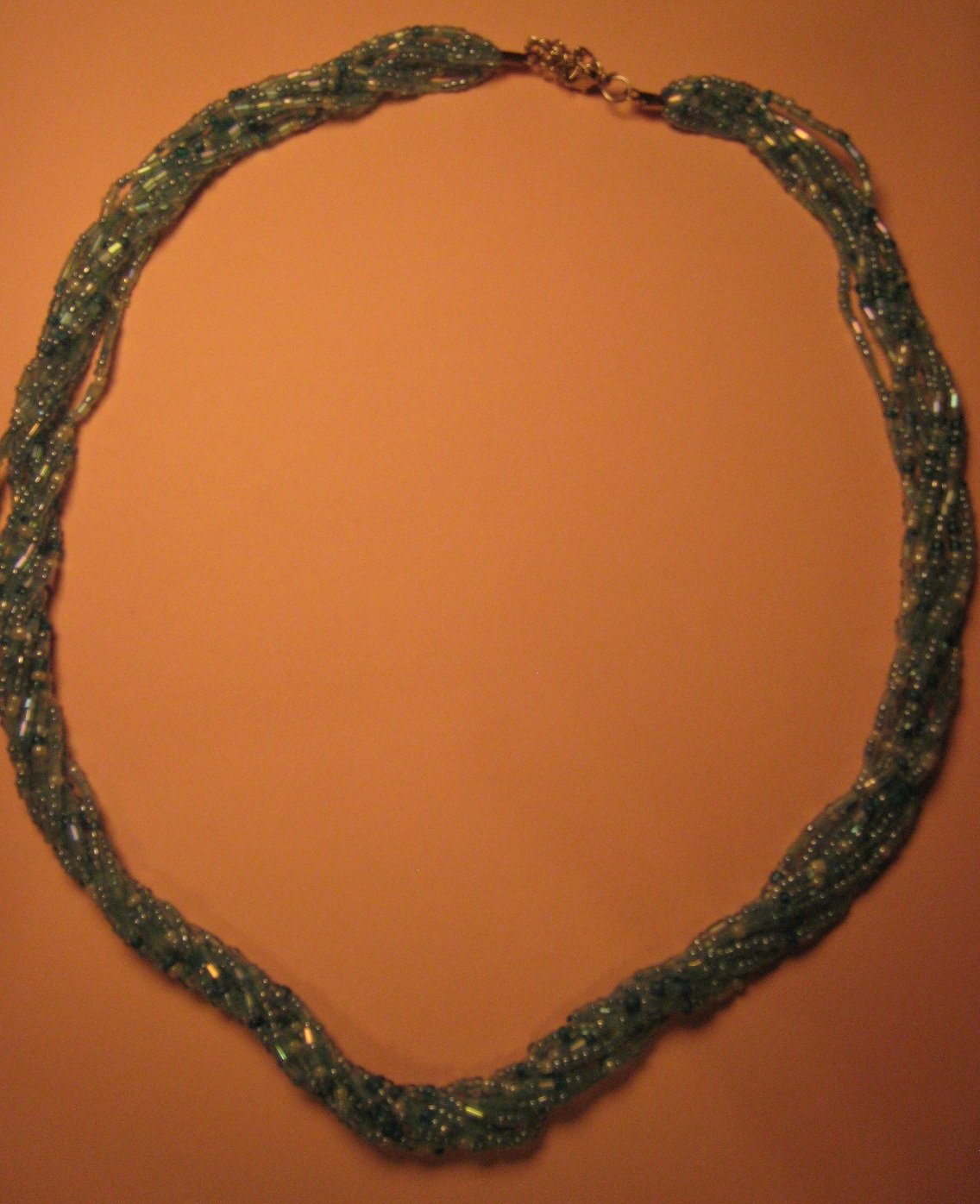 Multiple strands of tiny teal, sea, pearly & white seed beads twisted into a beautiful, stylish necklace measuring 22-24" long.