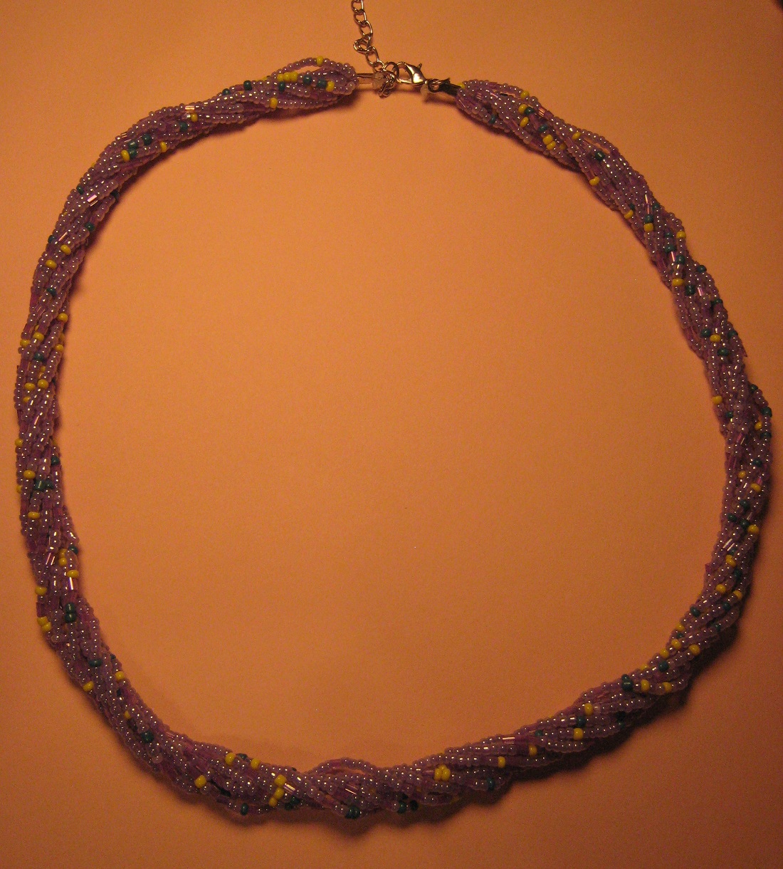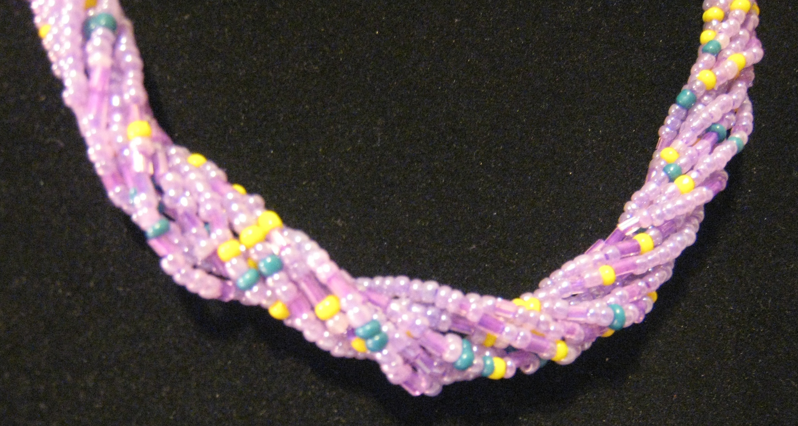 Multiple strands of tiny purple, pearly, teal & yellow seed beads twisted into a beautiful, stylish necklace measuring 22-24" long.