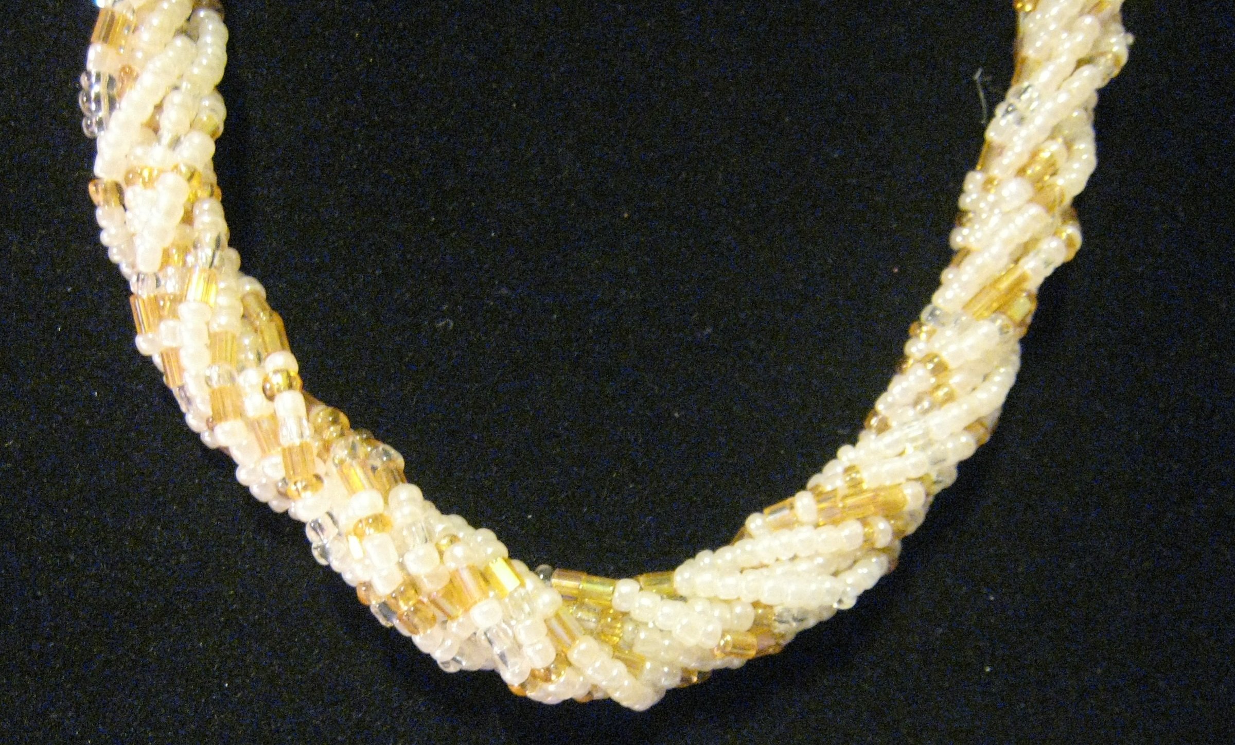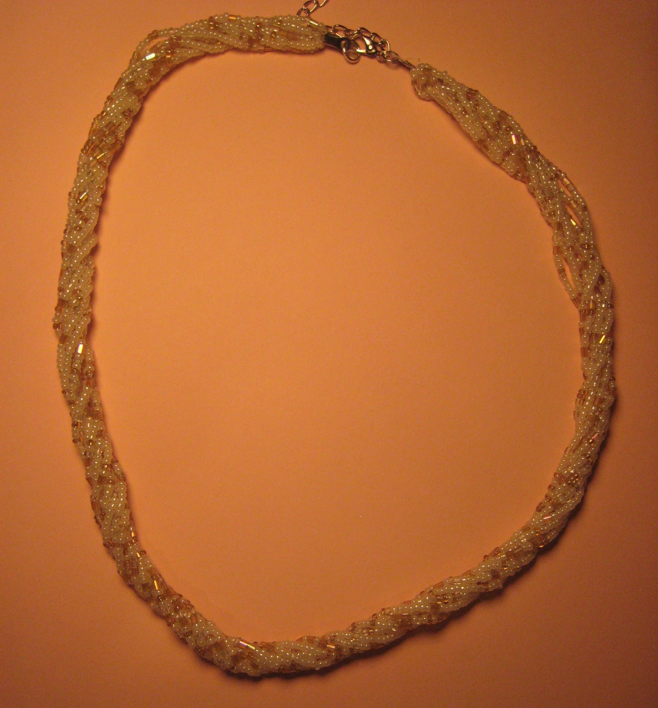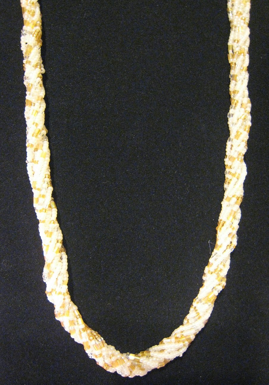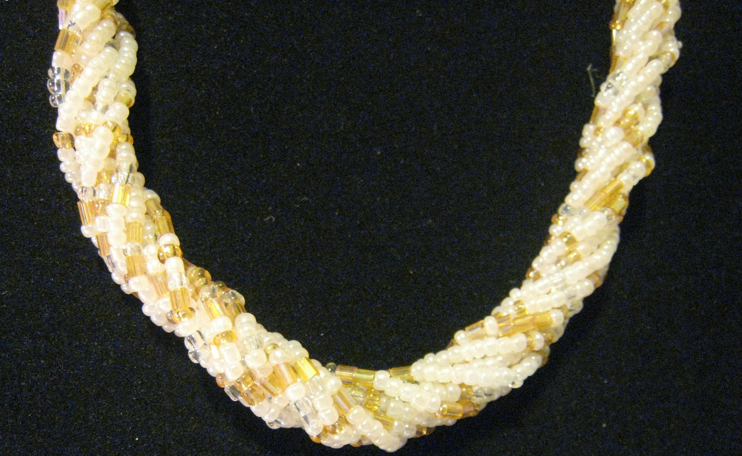 Multiple strands of tiny Pearlescent, amber & clear seed beads twisted into a beautiful, stylish necklace measuring 22-24" long.