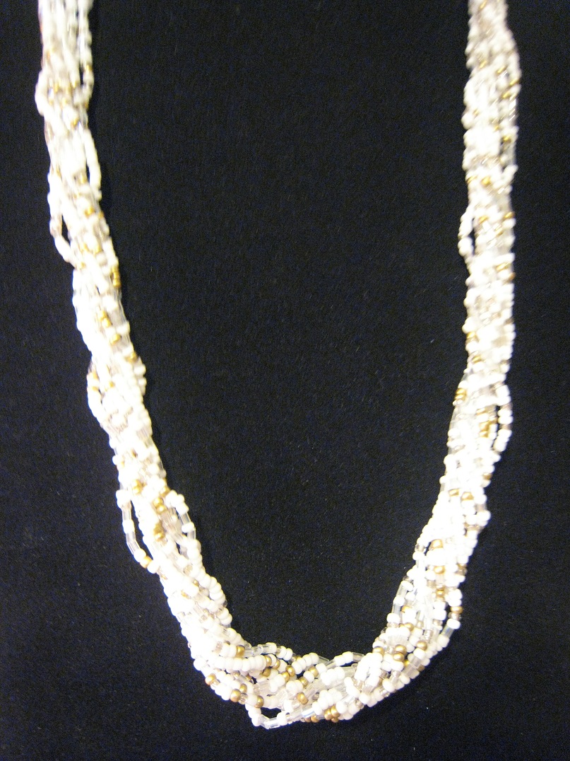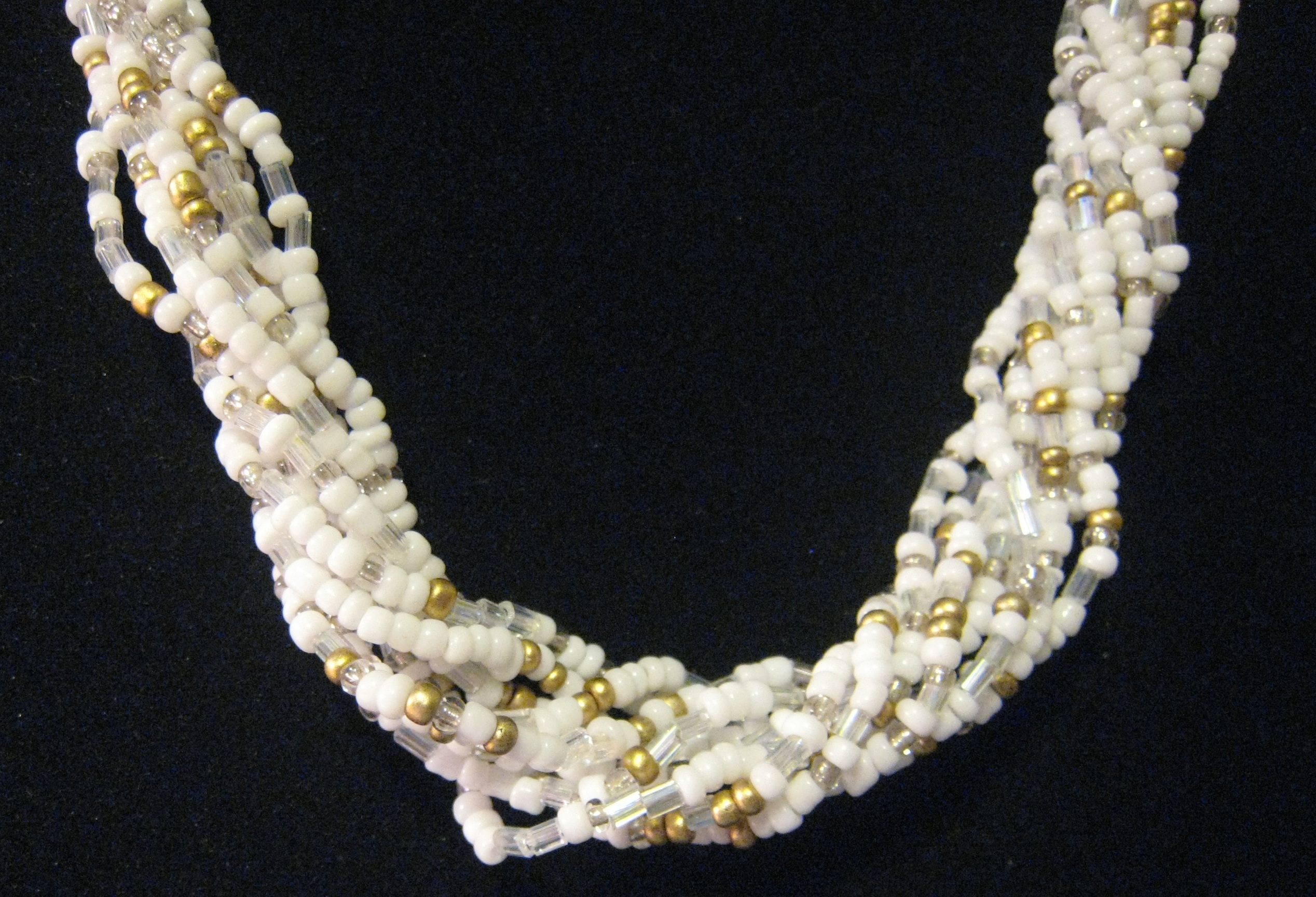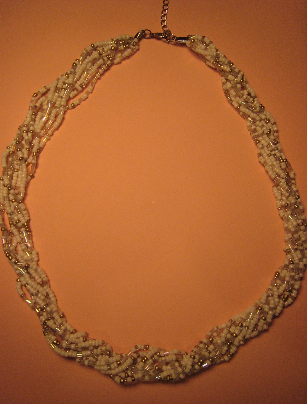 Multiple strands of tiny white, gold & clear ab seed beads twisted into a beautiful, stylish necklace measuring 22-24" long.
