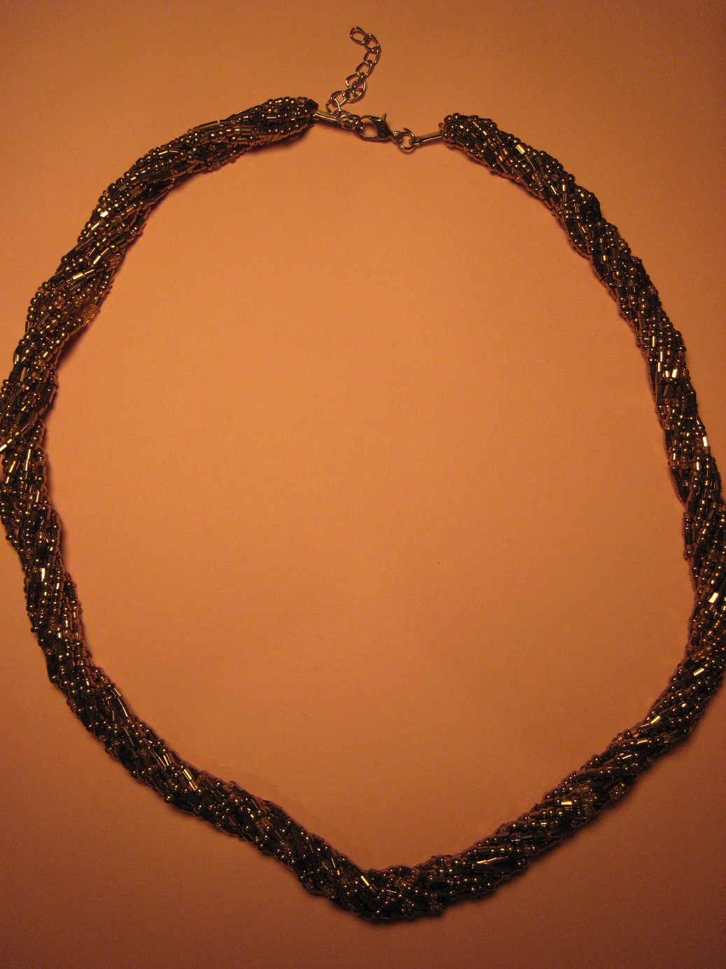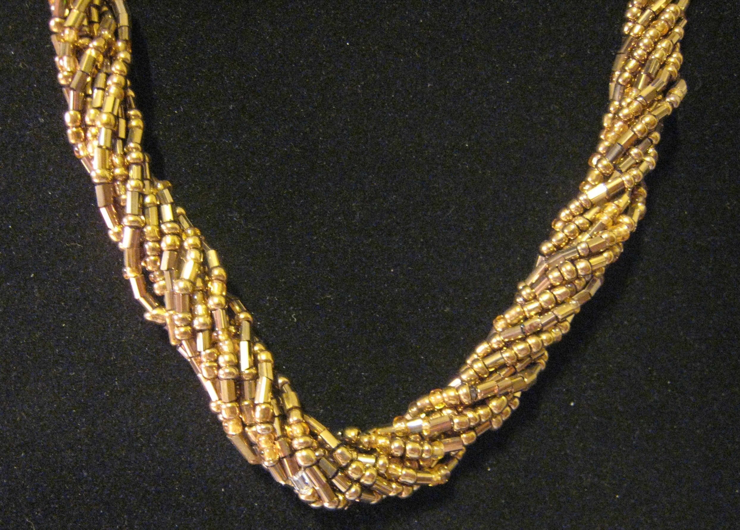 Multiple strands of tiny shiny gold seed beads twisted into a beautiful, stylish necklace measuring 22-24" long.