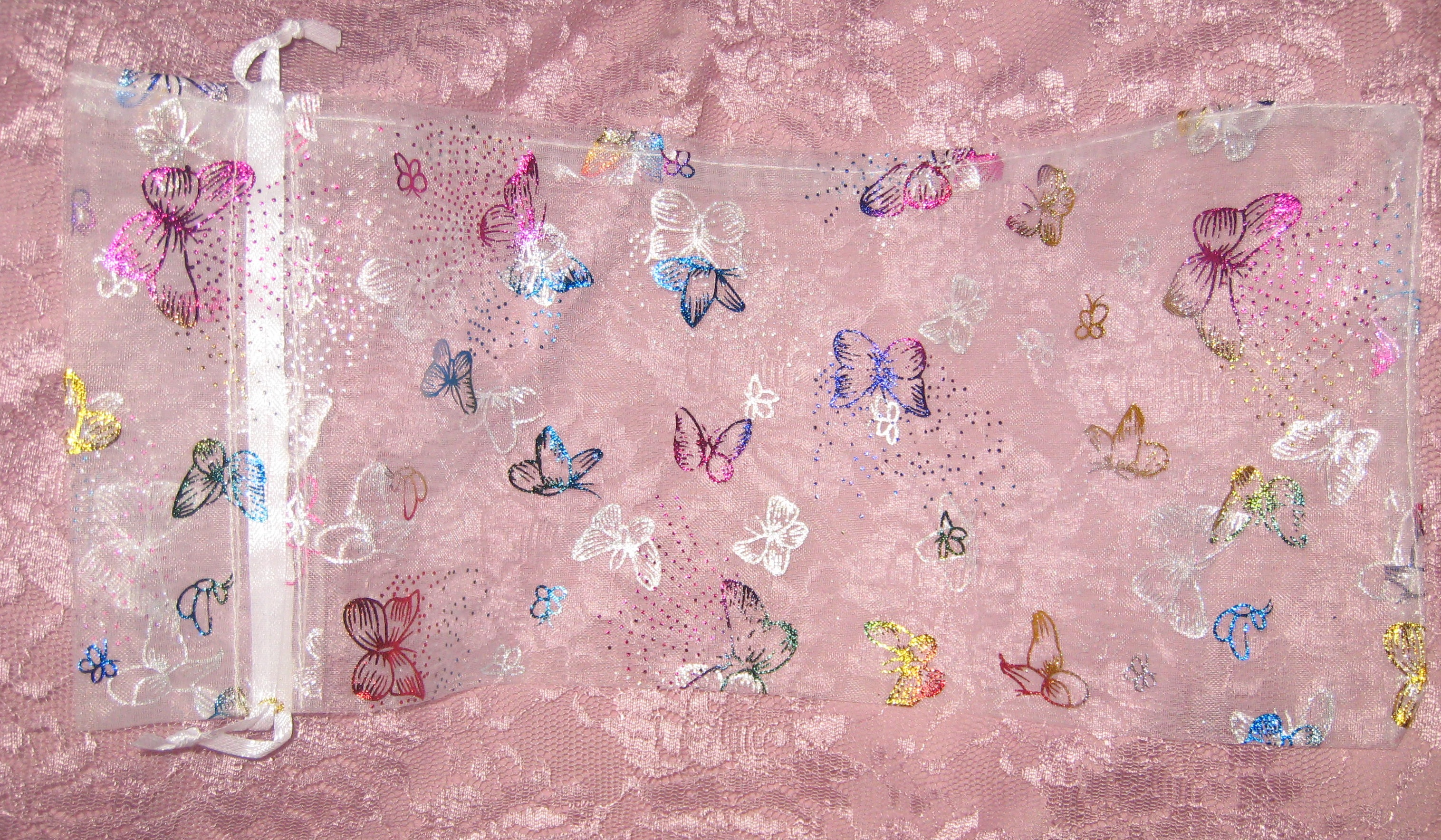 A pretty multicolored pattern adorns these organza 12-1/2x5 inch wine bottle covers.