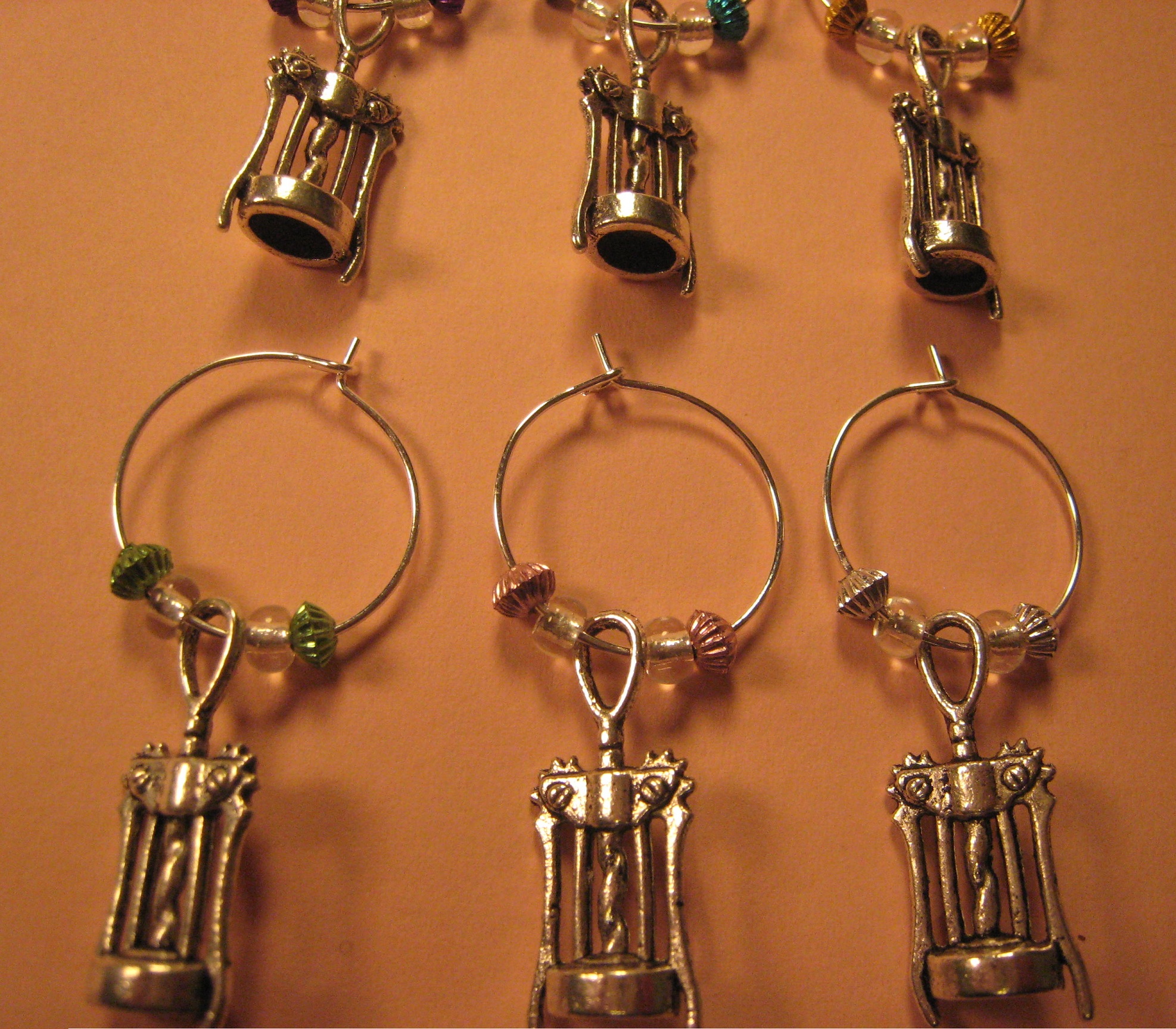 Each set includes 6 metal wine charms with plastic/acrylic beads packaged in a fabric pouch with a card reading: