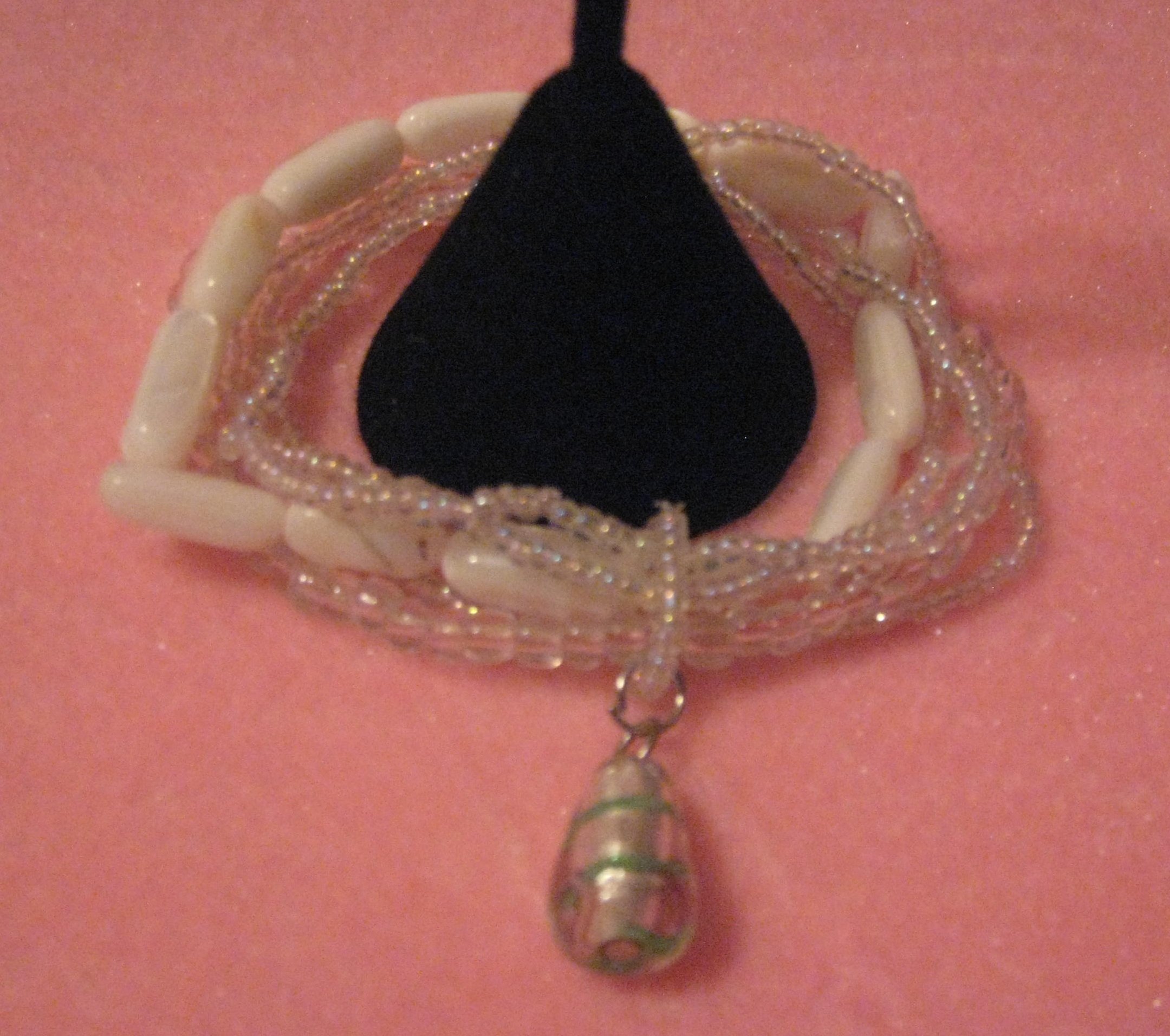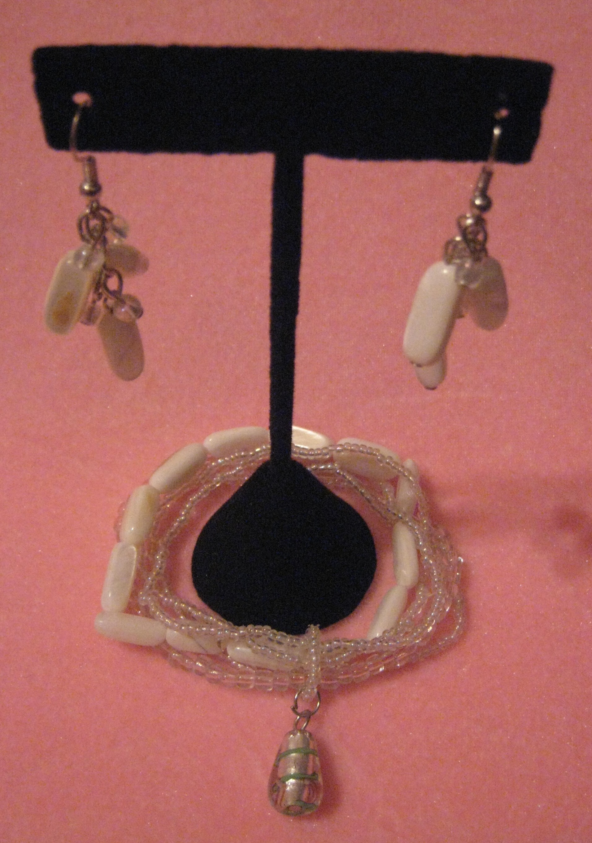 Multi-strand stretch bracelet and earring set with clear and white freshwater pearl shell, lampworked glass and seed beads. Silver-plated steel jumprings and earwires. Handmade beads may vary slightly in shape, size and color.