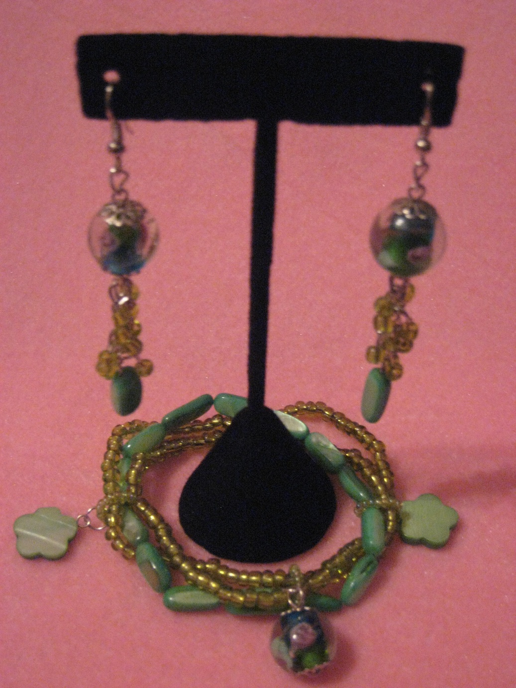 Multi-strand stretch bracelet and earring set with lampworked glass, freshwater pearl shell and seed beads that spring to life with lime and sea foam green colors. Silver-plated bead caps, jumprings and earwires. Bracelet is 7-1/2 inches. Handmade beads may vary slightly in shape, size and color.