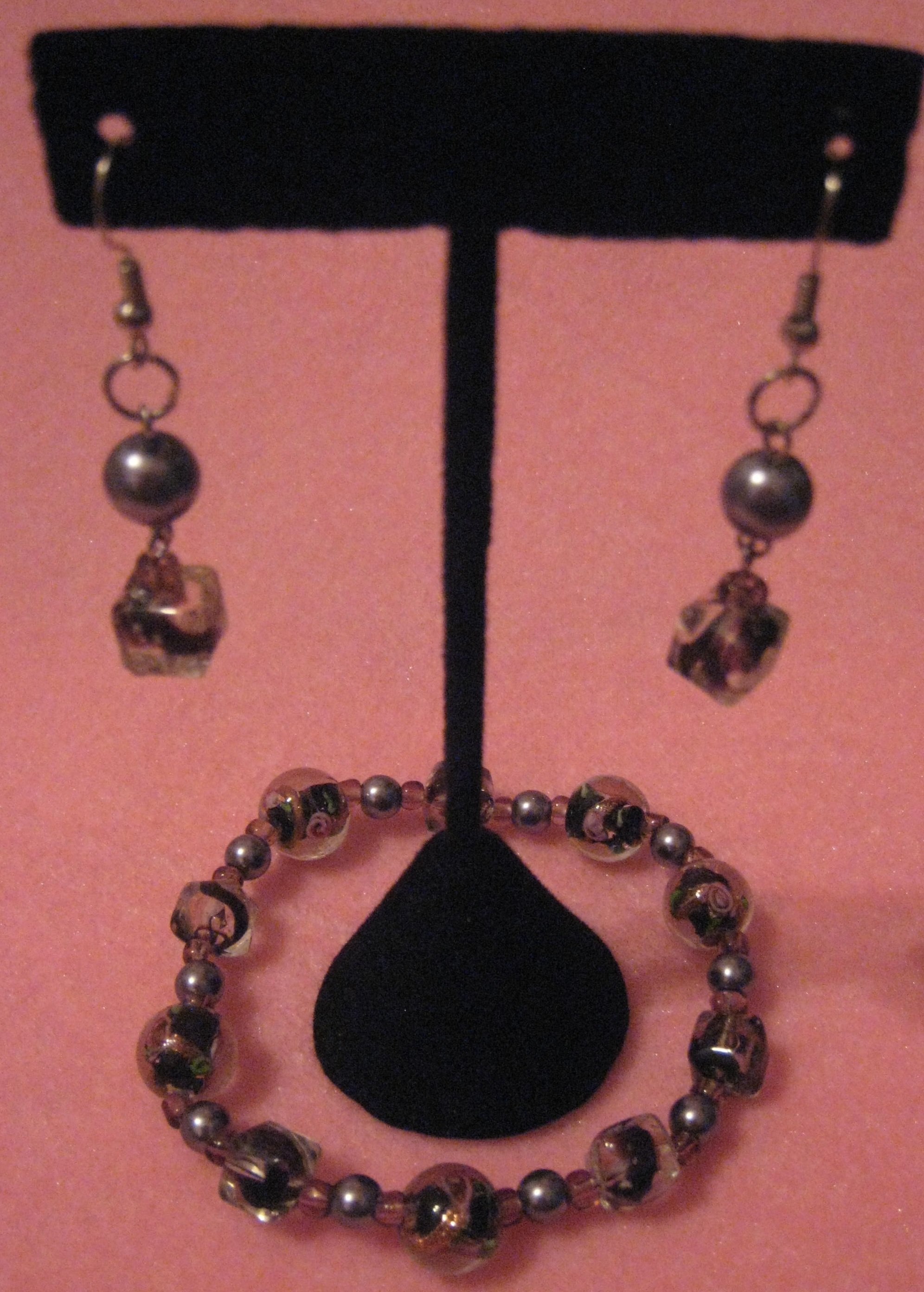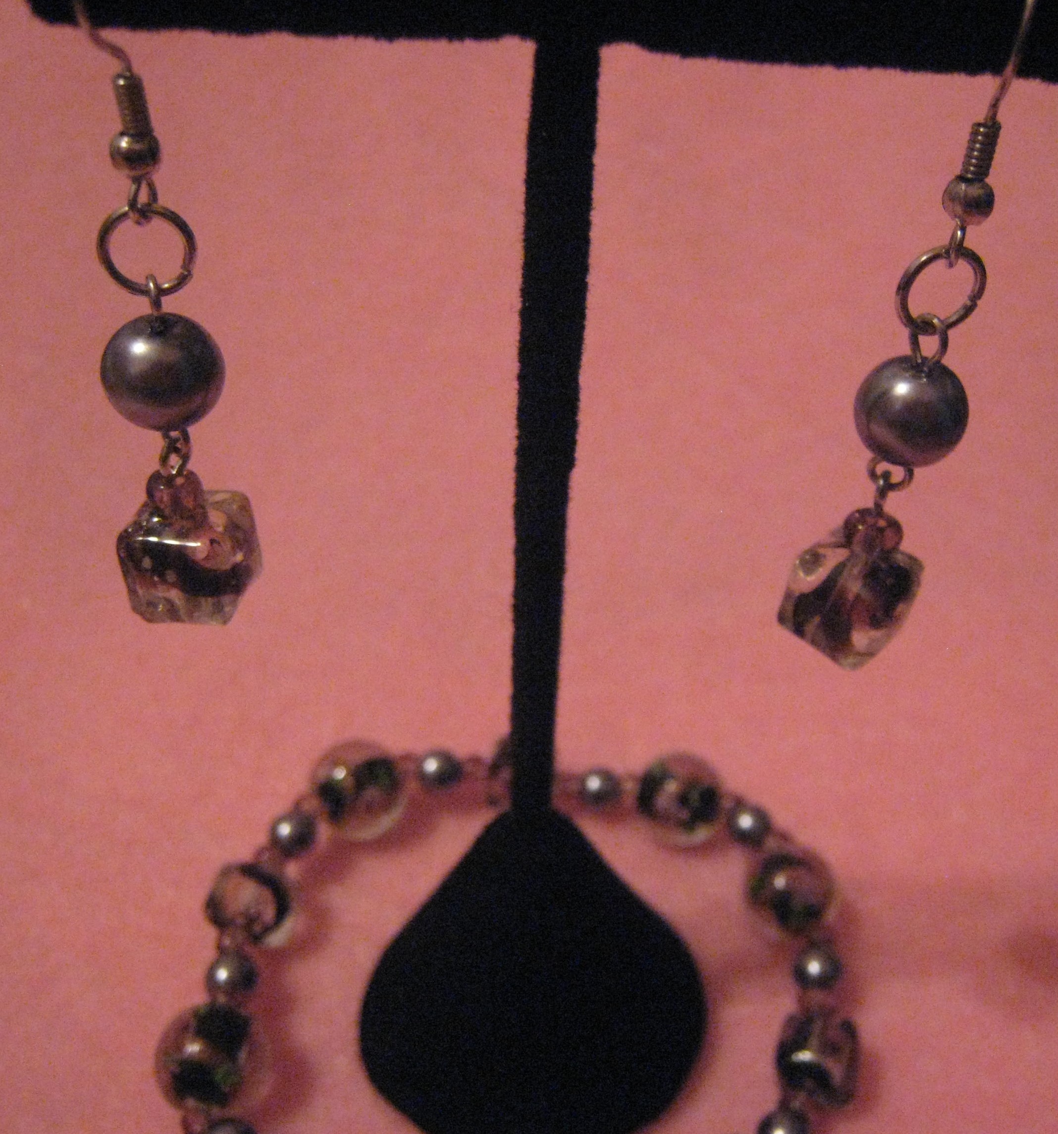 Single-strand stretch bracelet and earring set with black and clear lampworked glass cubes and seed beads are simple yet elegant baubles. Silver-plated steel jumprings and earwires. Handmade beads may vary slightly in shape, size and color.