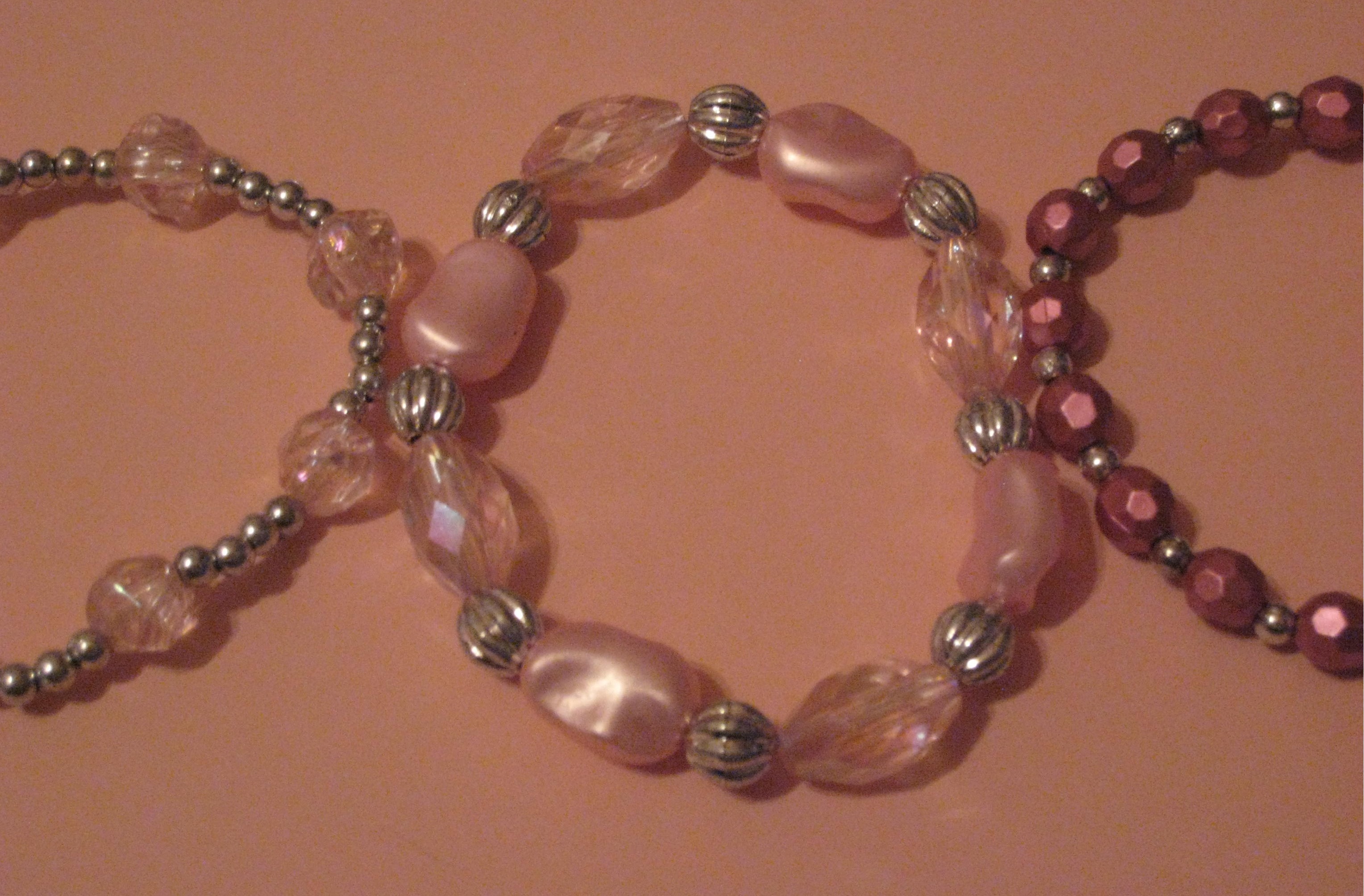 Lightweight and durable stretch bracelets highlighted with stylish beads in various shades of pink with silver spacer beads. Includes the 3 bracelets shown.